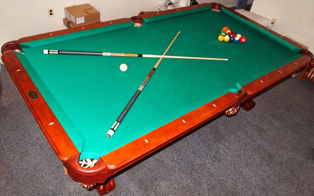 This 8 ft Cannon Georgian Model Pool Table is roughly 6 years old and is in Excellent condition. This table is from a smoke-free home.. The finish is Mahogany with green simonis cloth felt and not that cheap felt that needs replacing every 2-4 years..This table also includes leather pockets. All accessories including 6 mint condition cue sticks ranging from 18-21 ounces, 1 bridge stick, 1 short jump stick.1 seven stick and bridge wall rack, 1 wall mount score board, 9 and 8 ball racks, 1 brush and many more accessories.