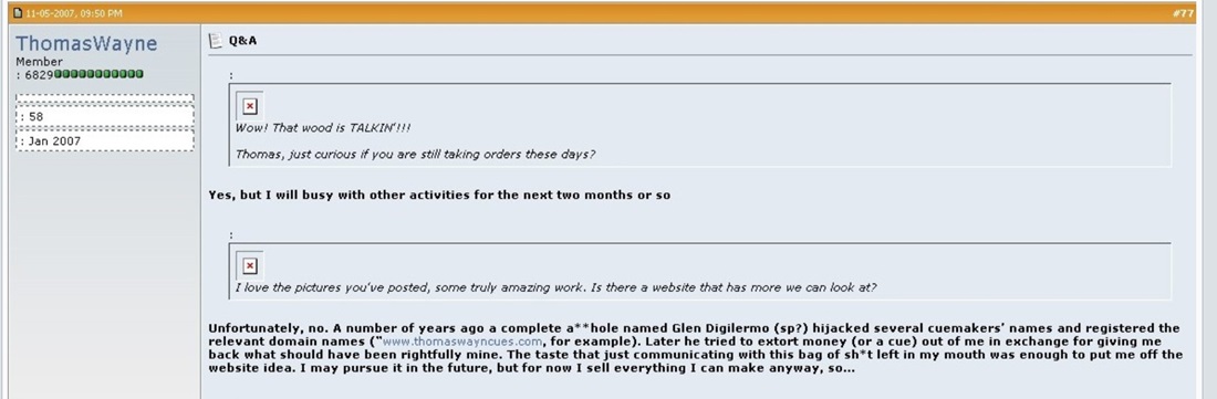 Recently there was a thread about Thomas Wayne cues on the forum. I have been a fan of his work since I saw an article about his Cues in Pool & Billiard mag. sometime back in the mid 90's. After reading the article, I tried to find more info about him and his cues, it was darn near impossible at the time and there is still very limited info available today. I have found out that he does more than build beautiful cues, he has also worked with Knife Makers and Furniture Manufacturers.