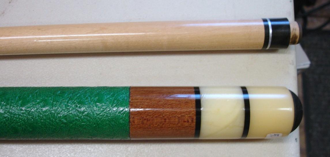 The bottom cue with that little 23 sticker is the type of sticker that was on all of the Asian made cues that Abe had for sale in his shop. It also has the very rounded rubber bumper that thins out on the edge to almost no height, like many Asian cues use, including most of the ones he had for sale when I visited him. Could Abe have changed the wrap on one of those cues. Yes. Or made a shaft for it? Yes. But to call it a conversion seems like a stretch. Abe sold Adam and other Asian cues. I have a few of Abe's cues with the Acrylic windows and a Florida cue. I am no expert on his cues or business, but I am afraid that people will start calling all the Asian cues he had forsale in his shop "Abe Rich cues" and in the long run, it will tarnish the reputation of the true quality of the cues he actually made.There are similarities to cues Abe built or converted, either in craftsmanship or materials.
