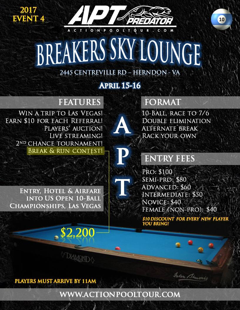 Event #4 of the 2017 season will be held at Breakers Sky Lounge in Herndon, VA!