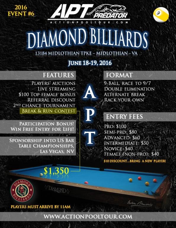 Event #6 of the Action Pool Tour season will be held at the beautiful Diamond Billiards in Midlothian, VA on the weekend of June 18-19. This is our last event before the summer break so don't miss it! Please share this post on Facebook and tell your friends!