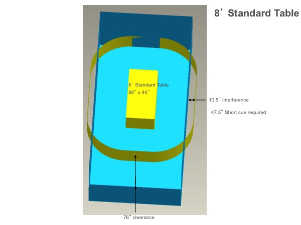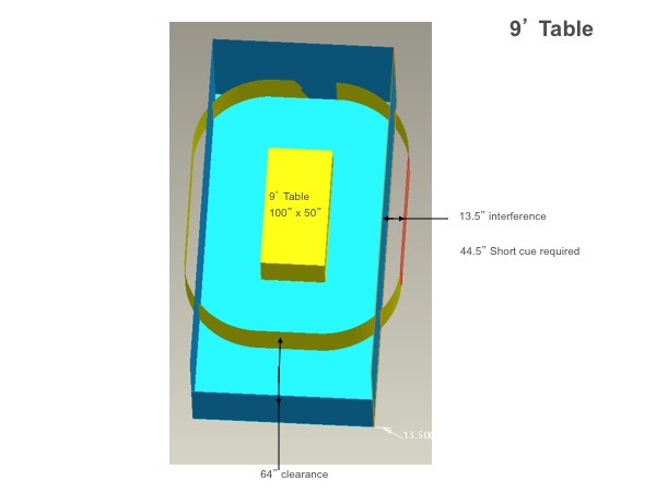 You should draw the table in, and then draw a border around it at a 60" distance from the playing surface. The border should have rounded corners with their center at the corner pockets. This will represent the end of the cue for a 58" cue + a 2" backstroke. Then draw a few more borders using the same technique but adjust the cue length to represent using a short cue. Make the table and borders all one "assembly" on the CAD program, so you can move it around as a single entity.