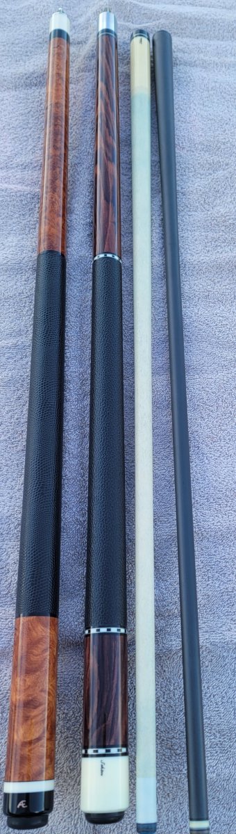 Beautiful AE Amboynia Mw Butt..15oz 1..Shaft..3.8oz..12.6mm 5/16×14 Leather Wrap $950 Schon Cocobolo Mw 2 Shafts 1..3.80z..12.75mm 2..3.9oz..13mm Leather Wrap 5/16×14 $875 Text For pics trying to upload...720 849 0430