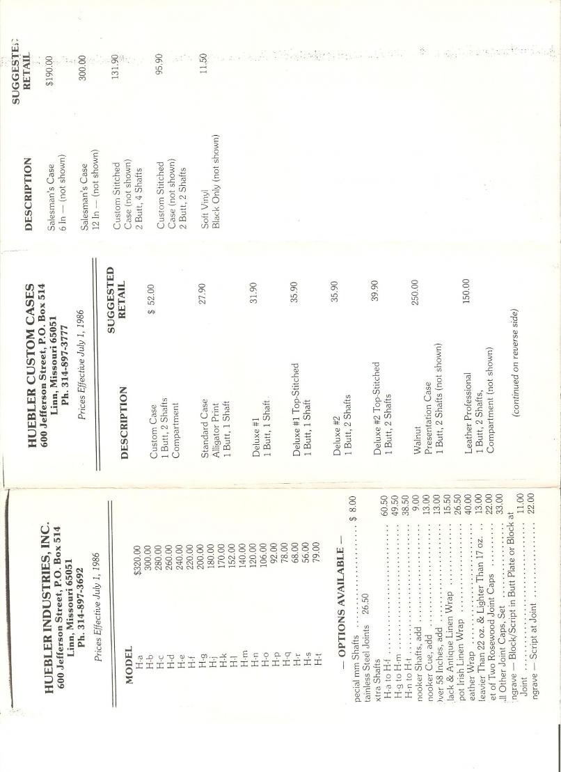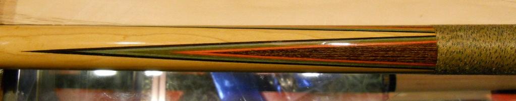 I was given a Huebler cue today , it has no shaft just the butt. The cue has 4 color points, orange, green, blue, black...checkerd rings at the joint and butt cap....the cue says " cue by Huebler made in the USA " when did they stop using this ID and switch to Huebler made in usa.....model and value would be nice......also what kind of wood, looks like cocobola maybe.......thanks OTB