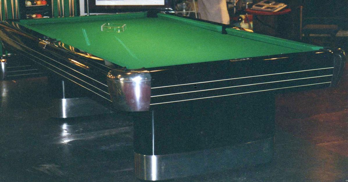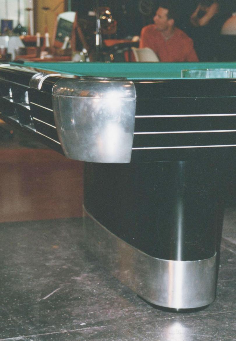 The 4 1/2' x 9' table has 3-matching pieces of 1" thick slates and walnut rail tops with cast aluminum corners. The two oval shaped legs are laminated with 6 inch polished aluminum bands. The legs are bolted to a massive base frame. The aprons with hand painted pin striping (95 feet) that fit under the rail tops are made of hardwoods contoured to flow into the rounded edge of the rails and the corner castings. This table has a black lacquer finish of many, many coats of primer, base coats and clear coats for a very deep and rich finish.