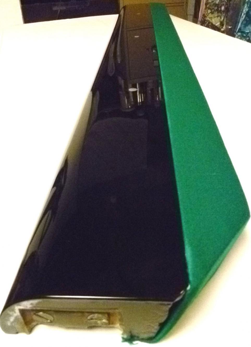 Included with the table is a matching custom made cue rack. The Anniversary Custom Cue rack was created to match the Anniversary table. This rack is new and has never been used. It has the same cast aluminum corners and the finish is in the same black lacquer. The rack holds ten cues that are highlighted by three halogen lamps with a mirror in the middle. There are also three sets of aluminum bars to hold the pool balls. The deep and rich finish is a black lacquer with many coats of primer, base coats and clear coats. The rack can be free standing or wall mounted. The measurements are 74" high by 41" wide and 7" deep.