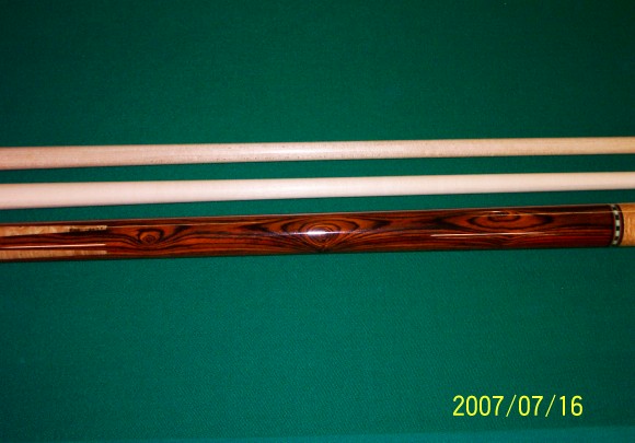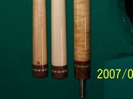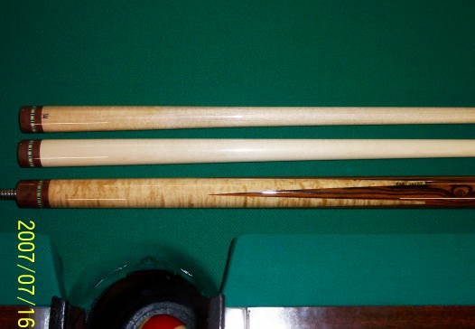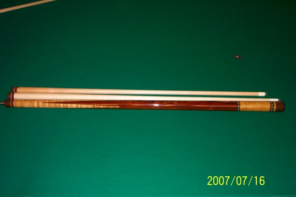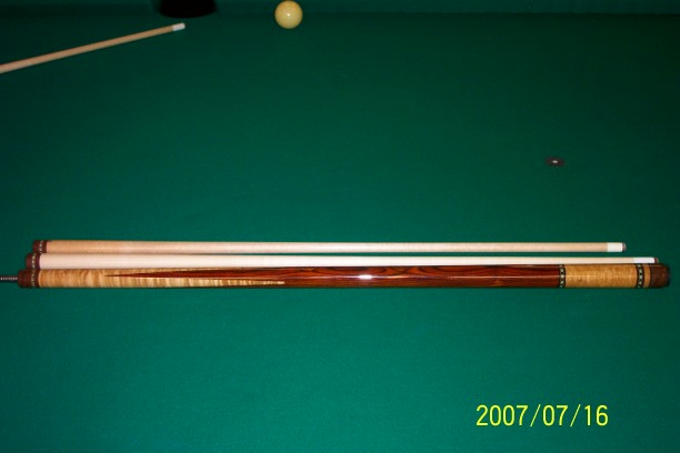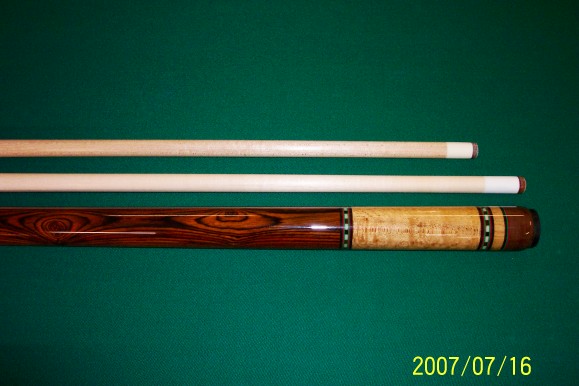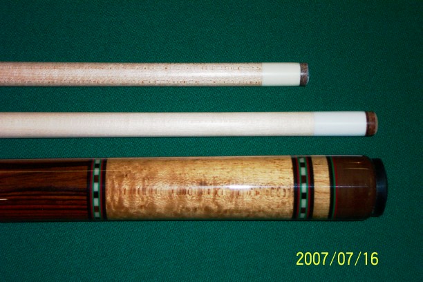Here is another cue that I built for a local customer. The cues forearm is Birdseye Maple, the handle area is Mexican Bacote, and the cues Butt is also Birdseye Maple. The butt with the shaft I made weighs 19.50, and 19.25 with the Predator shaft that I matched to the cue. The butt and shaft I made are both 30 inches long for a total length of 60 inches.