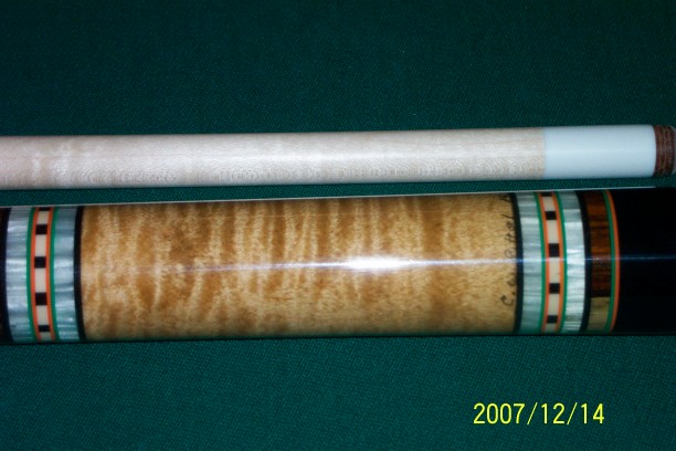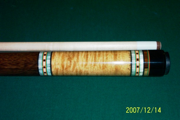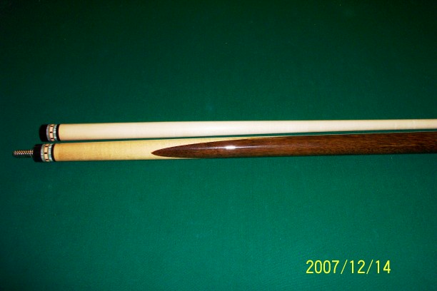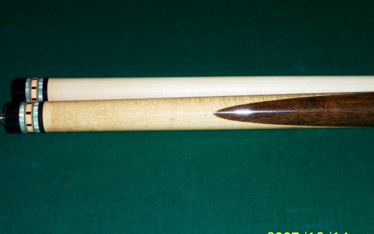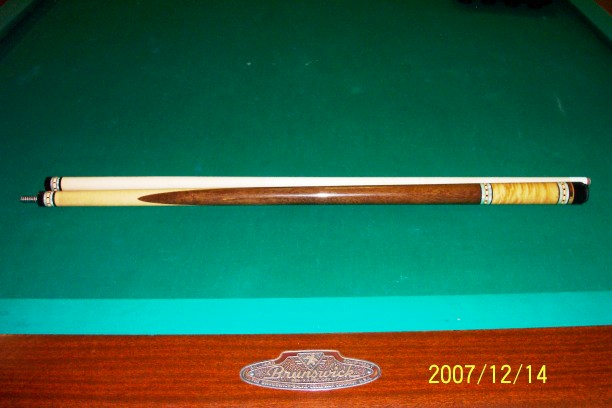 Here is the latest cue that I completed for a local Customer. It is a two point Butterfly Spliced Brazilian Rosewood into Maple Antique Brunswick one piece cue.
