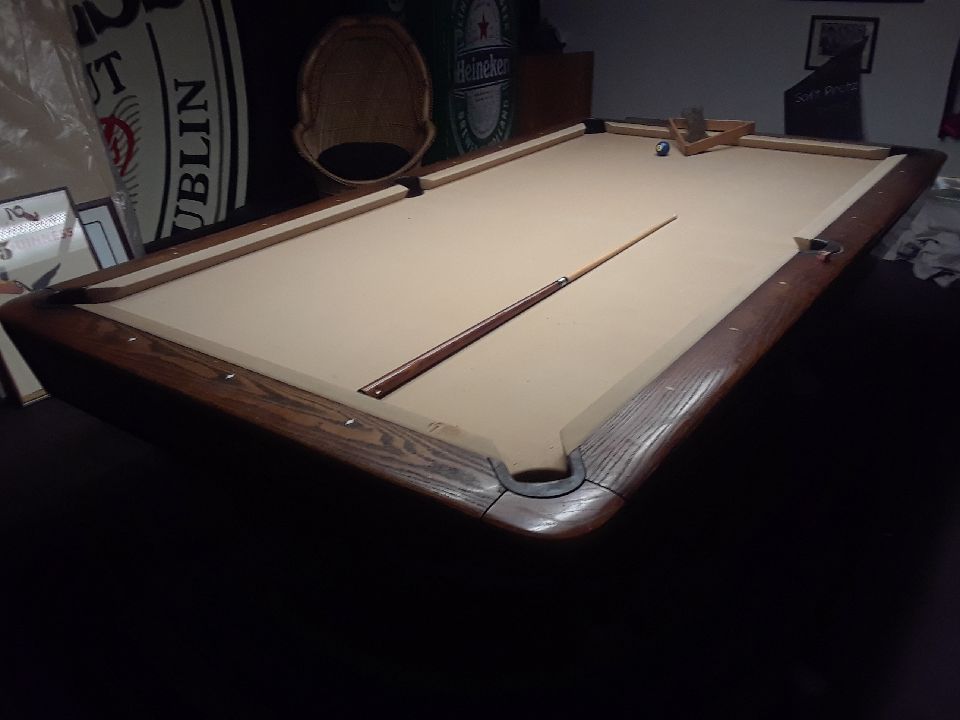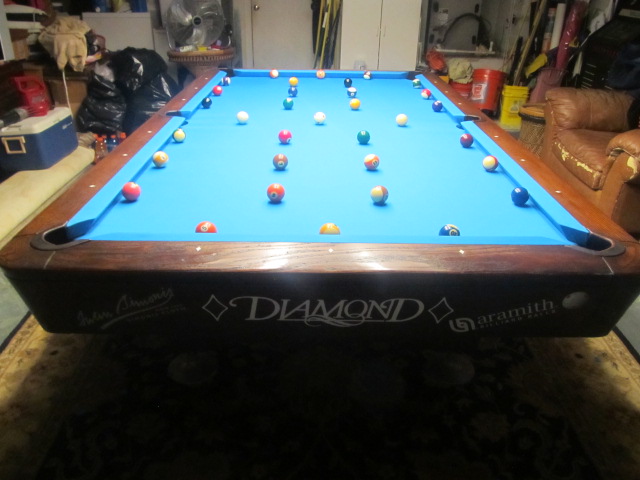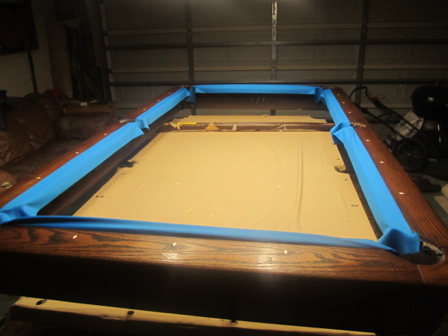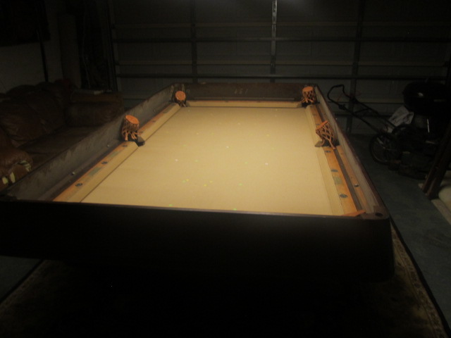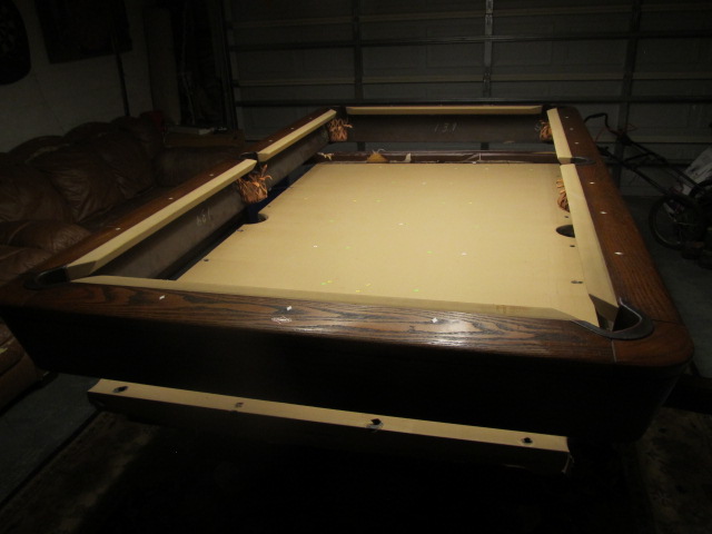So i got this Diamond 9ft table and wanted to see what the people i look up to have to say on how i did. After buying the table i didnt have enough for quality movers or new cloth I just knew it was a deal and i couldnt let it pass me up. After watching these guys disassemble and assemble it in less than 3 hrs (not including driving time) I was sure I would have problems later, and sure enough. The seams of the 3 piece slate came apart the second day after a 48 hr setup as per recommendations from table mover who should remain nameless. So after I saved and got the TB simonis 860 HR i was ready to finally play but the cheapest i could get to redo the cloth was $600. And after about 45 hrs of youtube videos i set out to do it myself. yeah i know. I bought a machinist level and away i went. This is what i started with.