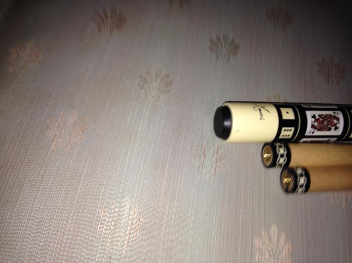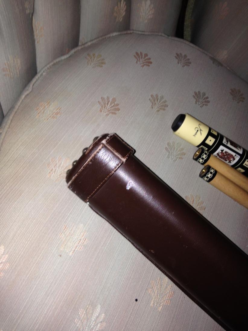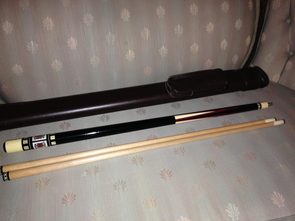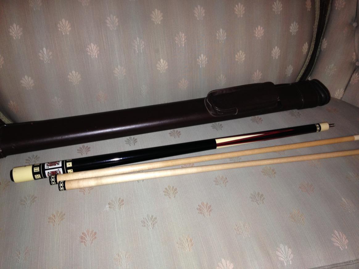 95 Series M-12 with two "pre-dot" shafts. Original tips on shafts, shafts are standard Meucci diameters. Card suit is clubs. Cue has been played, some surface imperfections as seen in photo's. The cue is 95% or better in my opinion. This sale includes a Whitten one by two case that has some dings and scuffs, but is a very serviceable case to protect the cue. Cue has been treated tenderly so condition is above average. I will guess the weight at 19 oz. $550.00 shipped and insured.