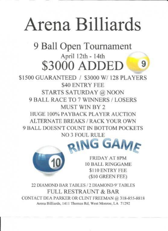 April 12-14 9 ball open tournament $3000 added