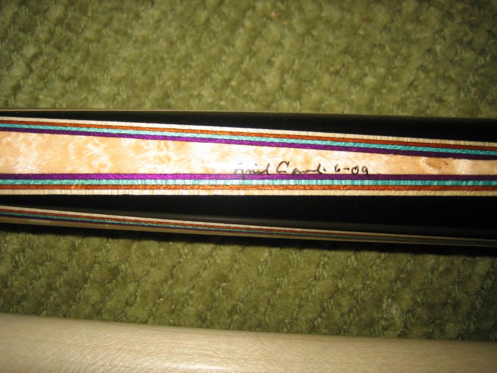 Signed 6-09, so this is a LOW mileage cue. I did play with it for one night (I play with just about all the cues I get) so there is chalk on the tip. By the way, it hits very nicely. I am a traditional 5/16-14 steel guy, but this hit is quite nice. Threads in shaft are VERY tight- you can easily tell this has not been together many times.