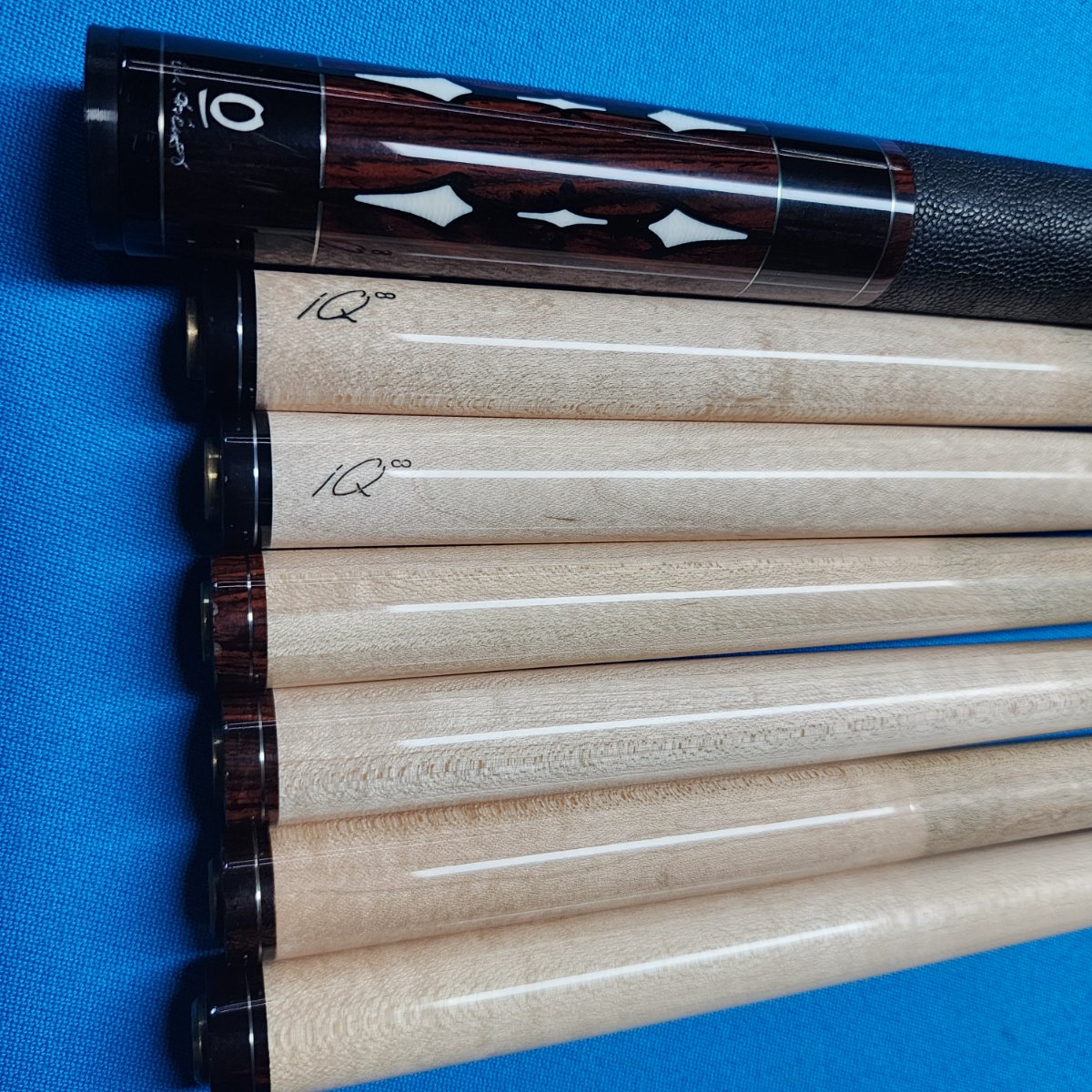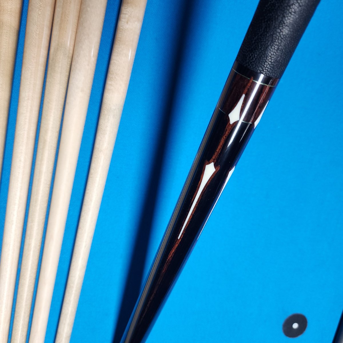 Cue was built in 1998. Beautiful 1/1 Arthur Custom Cue by Markus Dienst! All inlays are natural, nickel silver, ebony and cocobolo. Black genuine EE leather wrap.Cocobolo extension not pictured but included. Arthur Custom 5/16x14 Piloted Joint Pin. The cocobolo and ebony have an almost Ghost like effect in the forearm. Made in 1998 for Jee Hun Chun aka “Jimmy Nakamura”, the main dealer for Mezz in Germany and one of the oldest and best known dealers in Germany. While I bought this cue second hand, I've reached out to Jimmy and he graciously confirmed this provenance. The cue features a special "slim handle" design, a request by the Polish professional that was brought to life by Marcus.