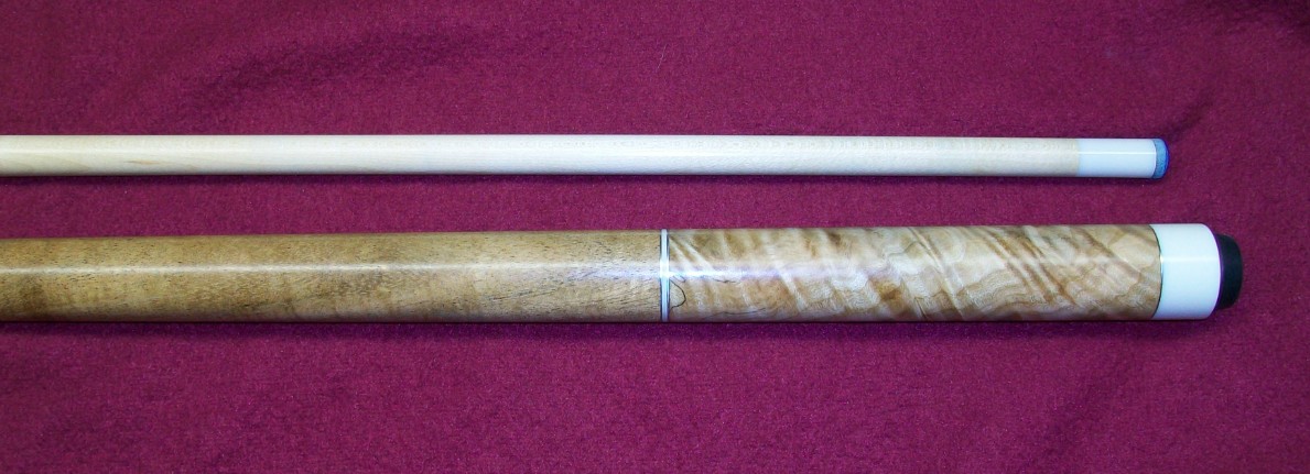 This is second cue I finished. My 10 yr old son wanted to make a cue and picked out the wood and worked with me on it. Birdseye Maple forearm, Curly Maple points, Black Palm Handle and Spalted Maple butt.