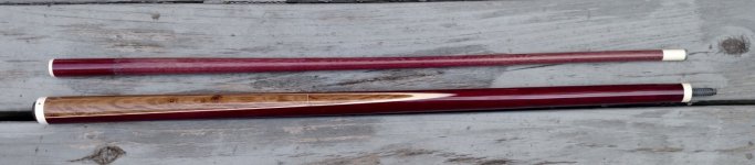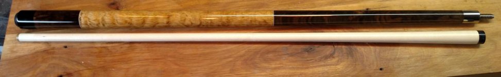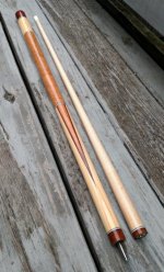 sac14214 AzB Gold Member Gold Member Silver Member Aug 26, 2018 #332 Recycled All wood here came from pallets. Maple, Cherry, MonkeyPod, and Pine. White rings are Corian counter top scraps. Honduran Rosewood off cuts used as veneer. Old cue ball used for ferrule. Made as a joke, but I kind of like it.