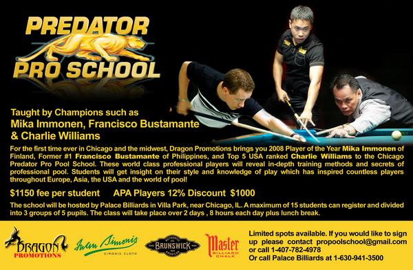 For the first time ever in Chicago and the midwest, Dragon Promotions brings you 2008 Player of the Year Mika Immonen of Finland , Former #1 Francisco Bustamante of Philippines, and Top 5 USA ranked Charlie Williams to the Chicago Predator Pro Pool School. These world class professional players will reveal in depth training methods and secrets of professional pool. Students will get insight on their style and knowledge of play which has inspired countless players hroughout Europe, Asia, the USA and the world of pool! This rare experience will be hosted by Palace Billiards and brought to you by Predator Cues, Simonis Cloth, Brunswick Centennial Balls, and Master Chalk.