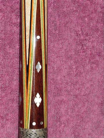 I have been told by some knowledgeable guys it is a Spain 5 veneer blank which is somewhat rare in itself. Another point is the aluminum inserts in the shafts. It looks like aluminum with a ss joint. I wonder if this joint has been pinned? It has a strong resemblance to my MF cue. The original shaft had alumnum around a brass insert in the shaft, just like the shafts pictured. A good pic of the weight bolt/screw my reveal even more. MF used a very large bolt (1/2") it would be interesting to see. I don't think that butt cap is original but once again who knows. Just a few thoughts for you. BTW my mop inlays are the same except I have a large diamond instead of the snow flake inlay.