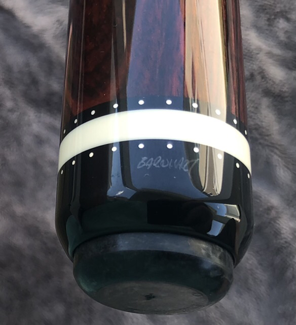 -Highly figured cocobolo butt sleeve, with a Juma Hoppe ring surrounded by silver dot inlays, and with a very unique spliced ebony point with veneers (very "old-school)