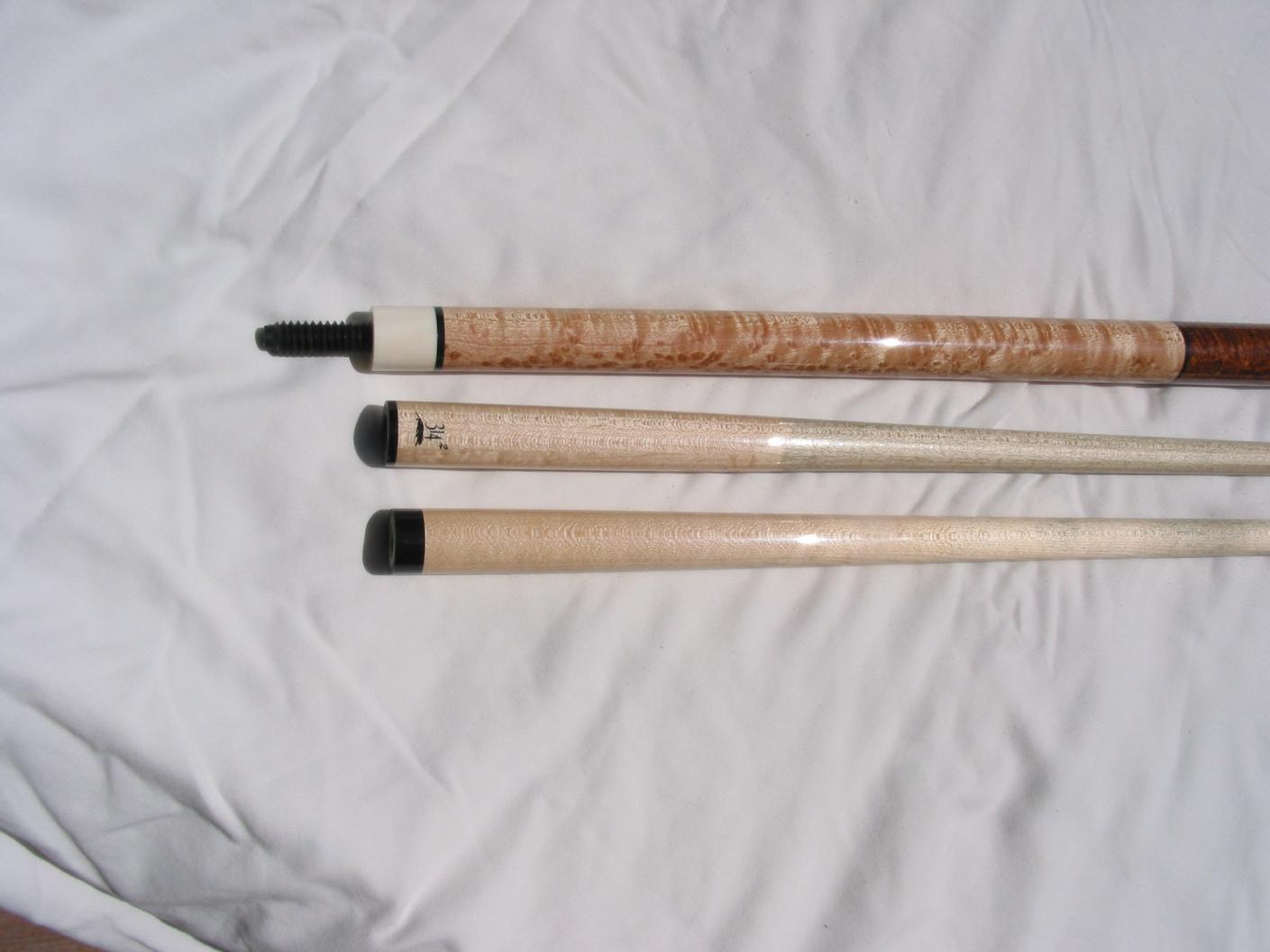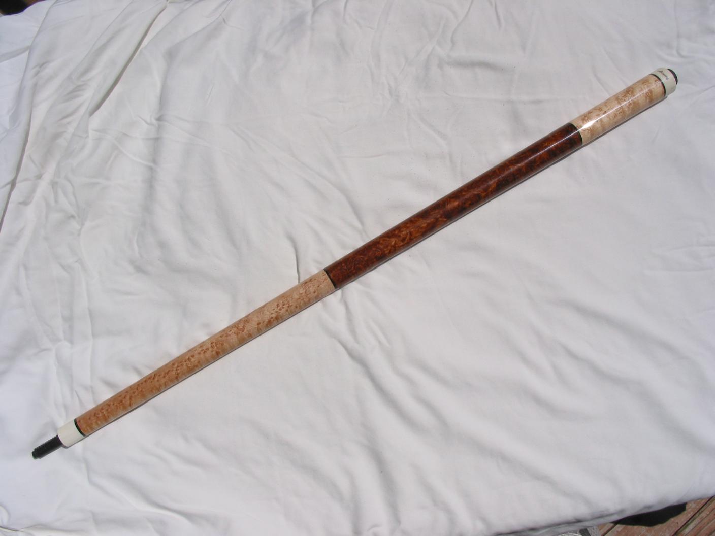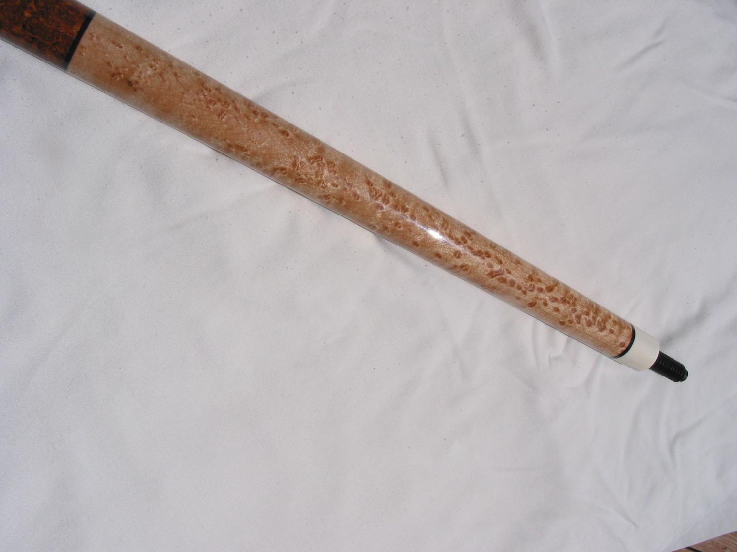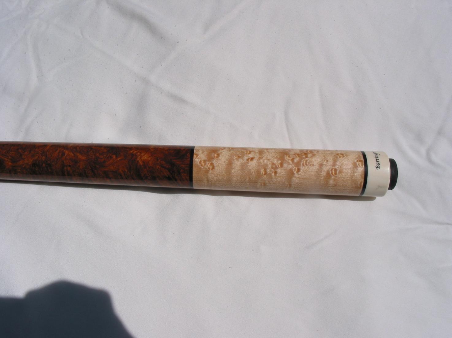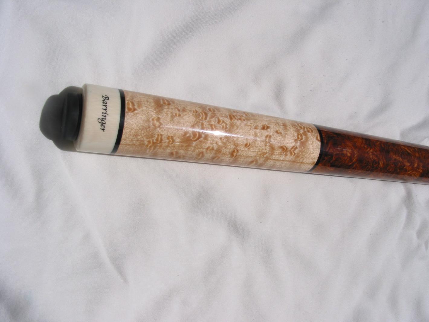 This is a nice Barringer cue with two shafts. One came with the cue the other is a matching predator from Syberts. As you can see it has some highly figured wood and very sold hit. It is a great player. It also has a little extra length if you like that or you are a taller player. If you are not familiar with Barringer cues check out his website.