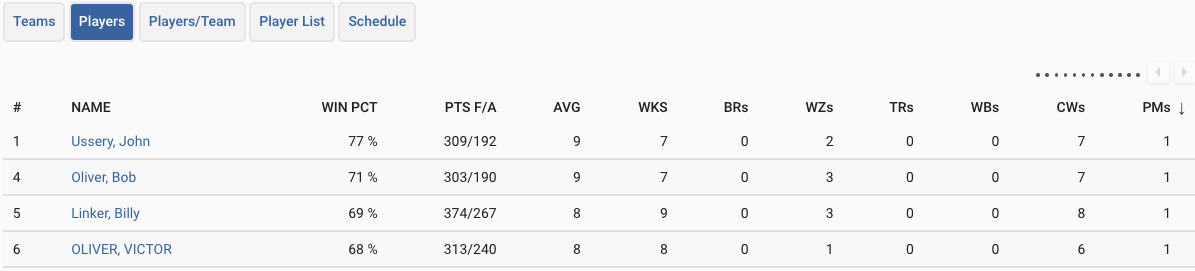 BRs is obviously "break-and-runs" and I'm guessing WZs is "win-zips" for games where all your opponent's balls are left on the table, but the others aren't obvious to me.