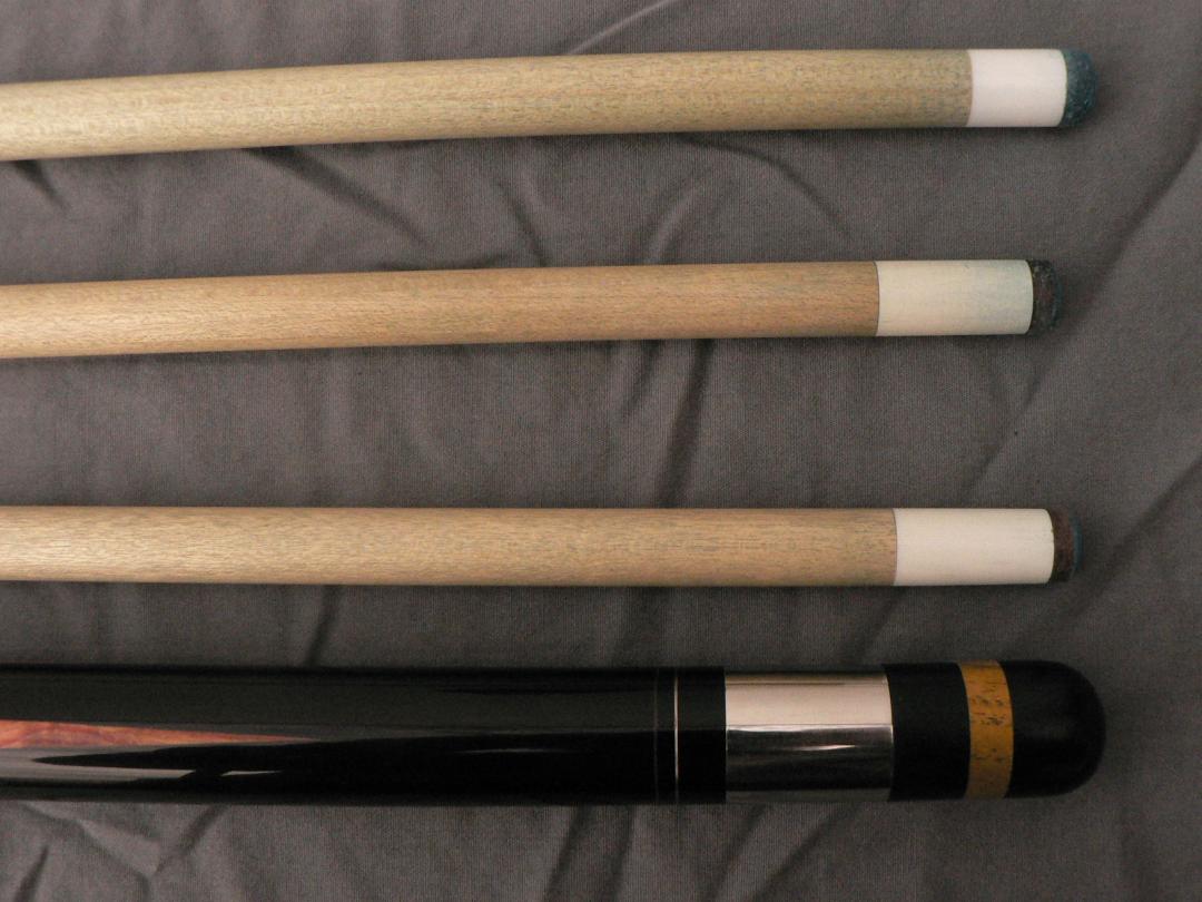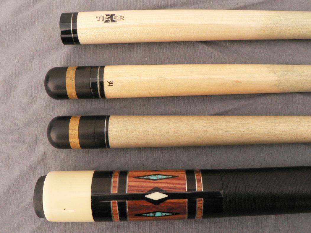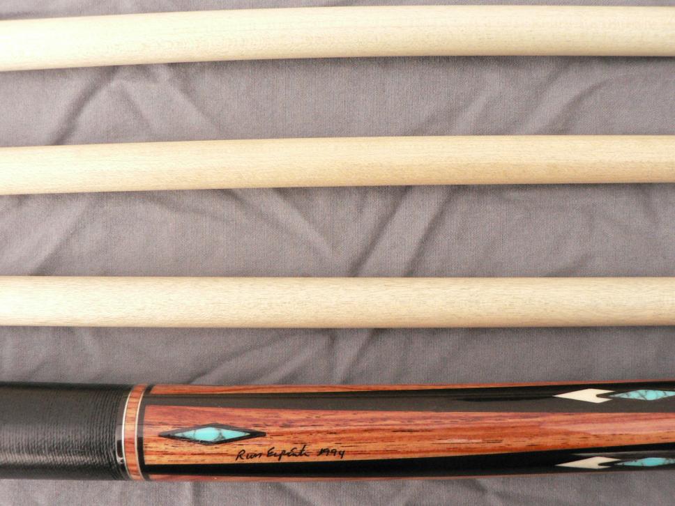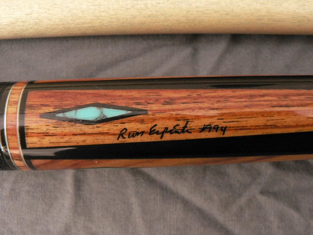 I have a one of a kind Russ Espiritu that I would like to sell. cue is signed Russ Espiritu 1994. cue is ebony with 4 cocobolo points and 4 cocobolo windows in the butt sleeve. each point and window has a turquoise diamond inlaid. 4 ivory diamonds between the 4 windows and in the forearm, between each point is a turquoise diamond surrounded by slotted ivory diamonds. the butt sleeve has 2 sets of dashed cocobolo rings and another solid cocobolo ring at the top of the wrap. black irish linen wrap. 5/16 x 14 steel joint. cue is in very good condition with one very small chip in the finish on one of the points. So small I could not get a good photo of it. Cue has 3 shafts, one original Espiritu shaft, one predator 314 shaft and 1 30 inch Tiger X shaft. the predator shaft was used soley for about 10 years and shows the wear but still very playable.
