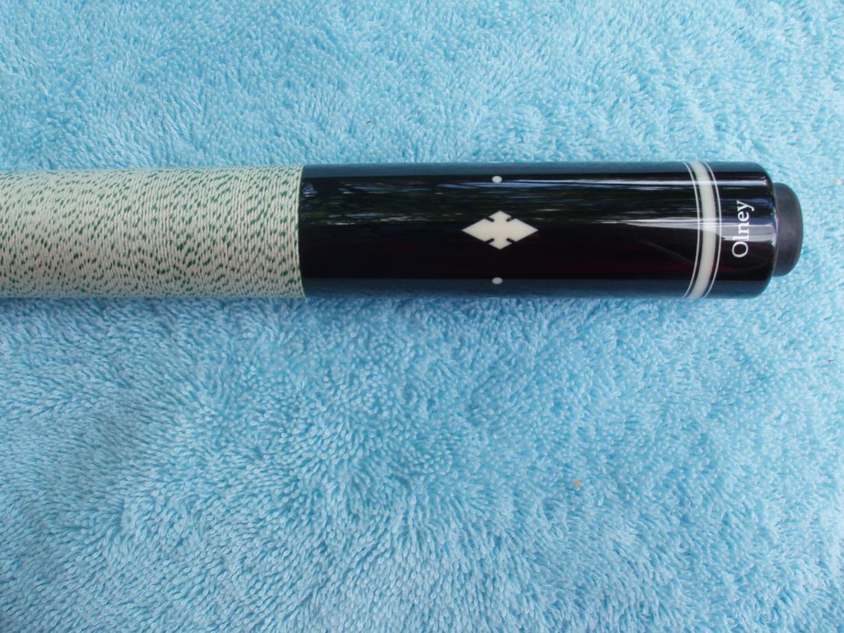 Up for sale my Jeff Olney cue. I thought I would never sell it, but at age 92 my eyes aren't what they used to be and this cue doesn't belong in the closet. Some one is going to be very happy with this monster. Specs are listed below. The cue is a Bushka design.