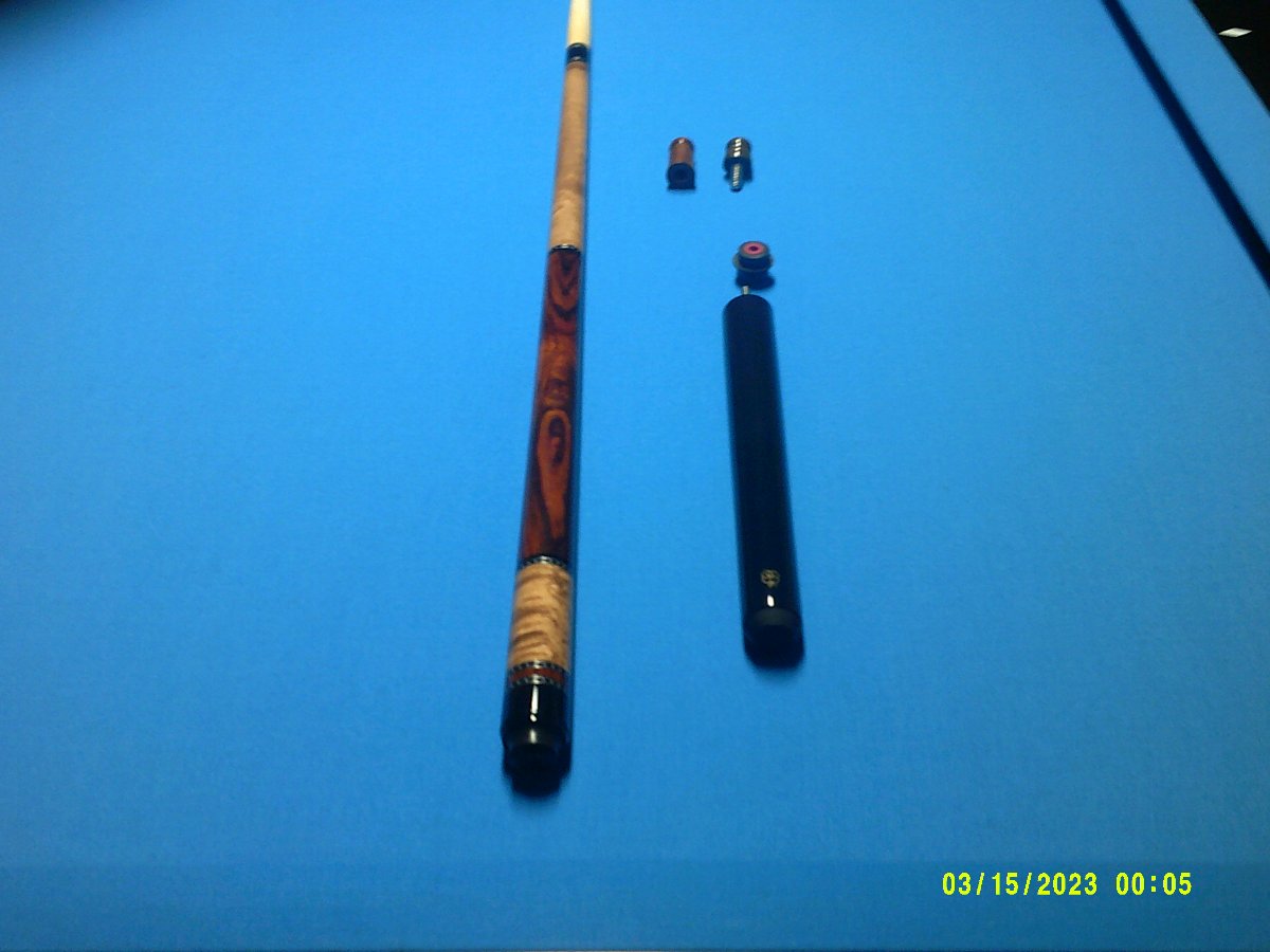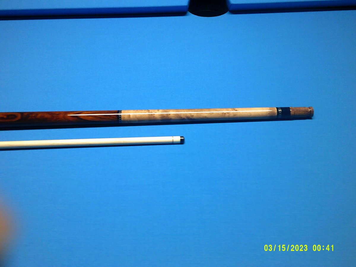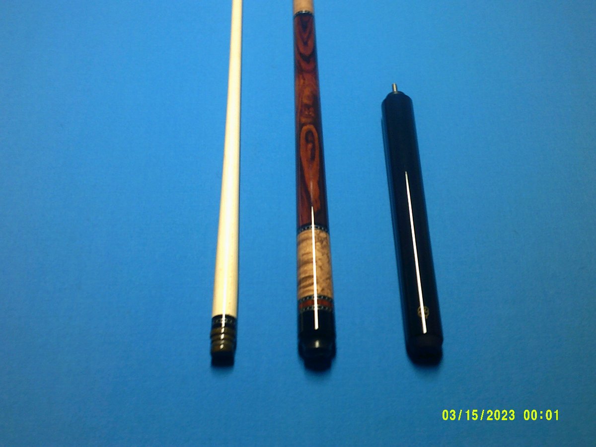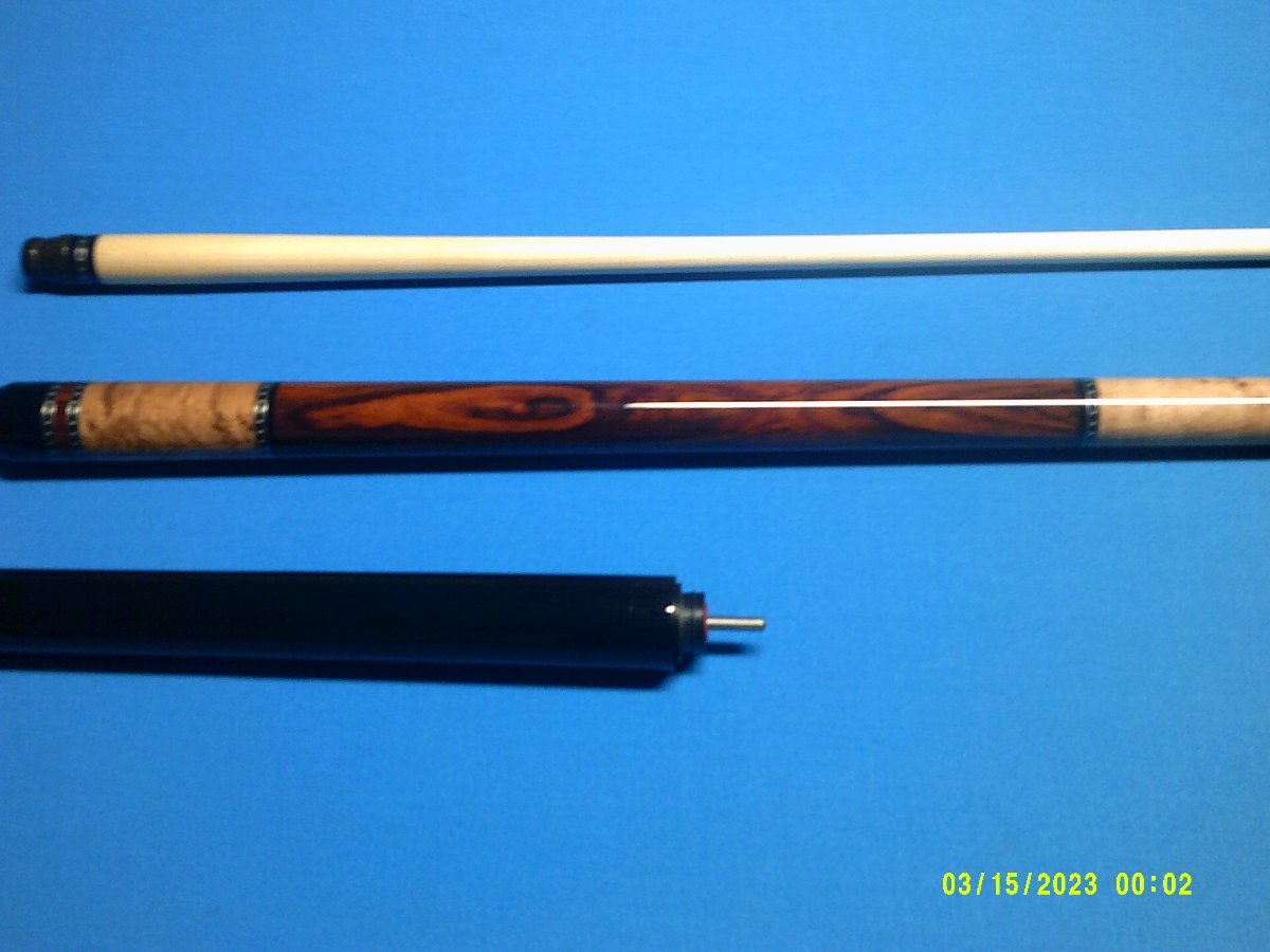 I previously listed this cue here with other items. All other items have been sold, I'm thinking this cue got lost in the shuffle. This is a gorgeous merry widow with a highly figured cocobolo wrap, stained maple forearm and sleeve with railroad rings. I bought this cue new about four years ago. It was a cue of the month cue, can not remember the model number. I bought it mainly because it looked so good. Cue appears to be much more expensive then it is. I have only played it a hand full of times and every time I used it at least one person said, "nice cue." This cue looks much better in person, photos cannot do it justice, especially if I am taking the photos. I paid $560.00 for it new and in it's current condition could easily pass as a new cue. No scratches or blemishes of any kind! Also includes 11" rear extension with compatible bumper. The G Core shaft has never hit a ball, I used a Becue shaft on it the few times I played it. This shaft is the original shaft that was sold with the cue, it has matching ring work. Both the butt and the shaft are laser straight. The joint is 3/8x10 and I am throwing in a set of hard wood joint protectors with a bright finish. Best part - You can steal this package for only $325 and I pay the shipping to your house. I am only selling because I very seldom have the opportunity to play it. I apologize for the quality of the photos in advance. I have multiple weight bolts and can ship this cue at 19oz, 19.5oz, or 20.5oz