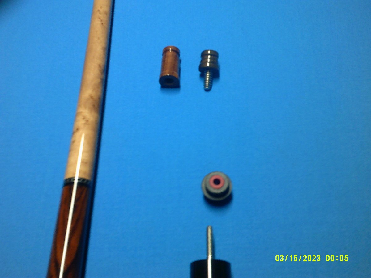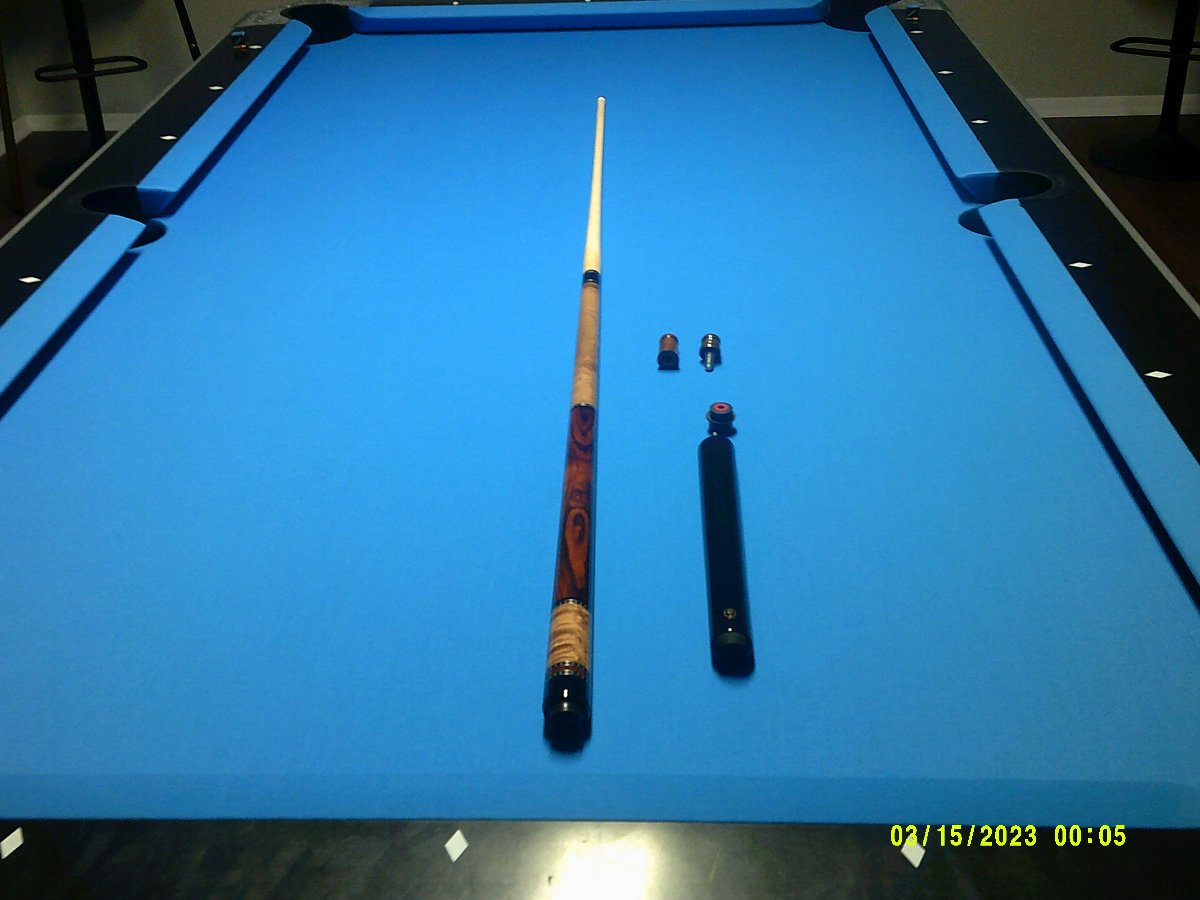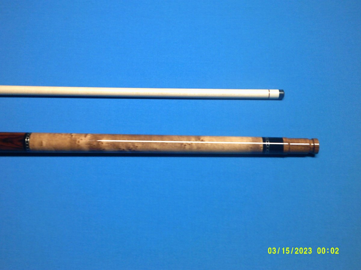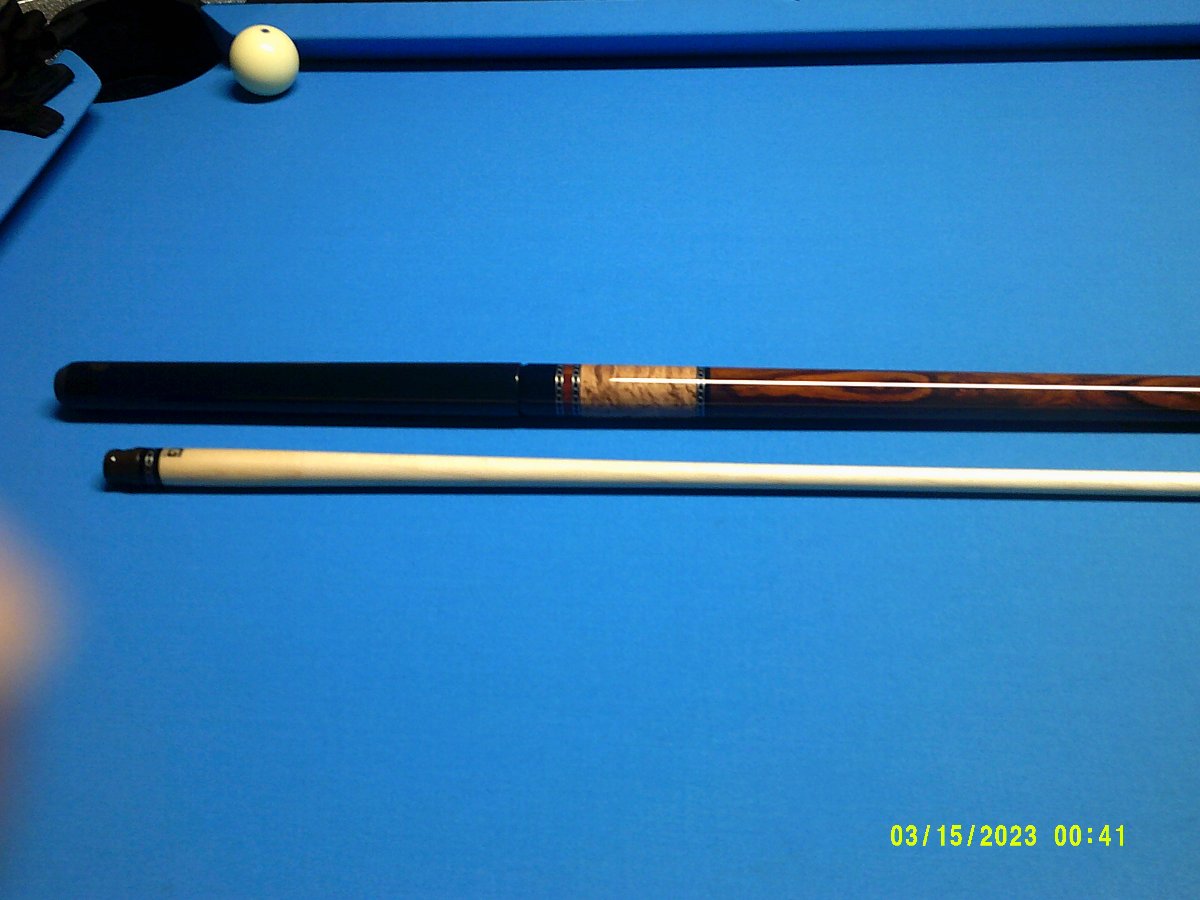 I previously listed this cue here with other items. All other items have been sold, I'm thinking this cue got lost in the shuffle. This is a gorgeous merry widow with a highly figured cocobolo wrap, stained maple forearm and sleeve with railroad rings. I bought this cue new about four years ago. It was a cue of the month cue, can not remember the model number. I bought it mainly because it looked so good. Cue appears to be much more expensive then it is. I have only played it a hand full of times and every time I used it at least one person said, "nice cue." This cue looks much better in person, photos cannot do it justice, especially if I am taking the photos. I paid $560.00 for it new and in it's current condition could easily pass as a new cue. No scratches or blemishes of any kind! Also includes 11" rear extension with compatible bumper. The G Core shaft has never hit a ball, I used a Becue shaft on it the few times I played it. This shaft is the original shaft that was sold with the cue, it has matching ring work. Both the butt and the shaft are laser straight. The joint is 3/8x10 and I am throwing in a set of hard wood joint protectors with a bright finish. Best part - You can steal this package for only $325 and I pay the shipping to your house. I am only selling because I very seldom have the opportunity to play it. I apologize for the quality of the photos in advance. I have multiple weight bolts and can ship this cue at 19oz, 19.5oz, or 20.5oz