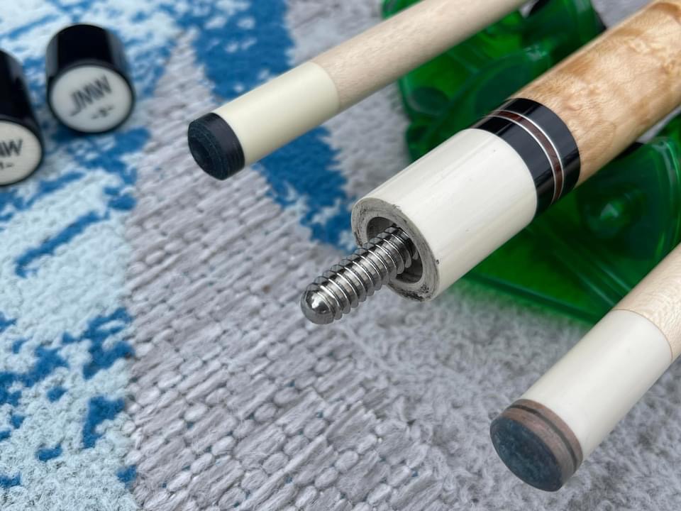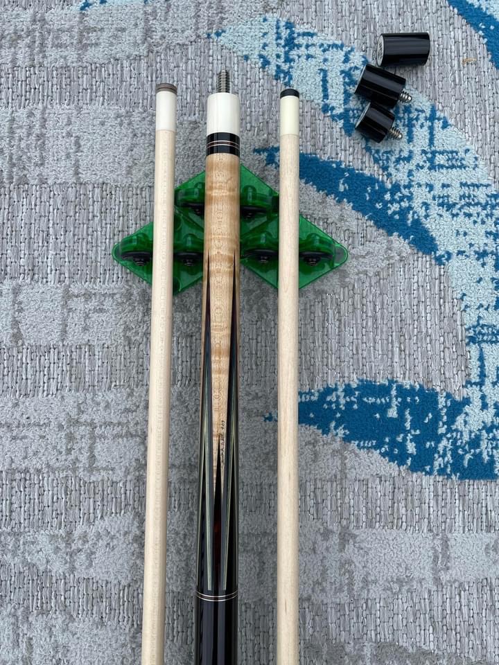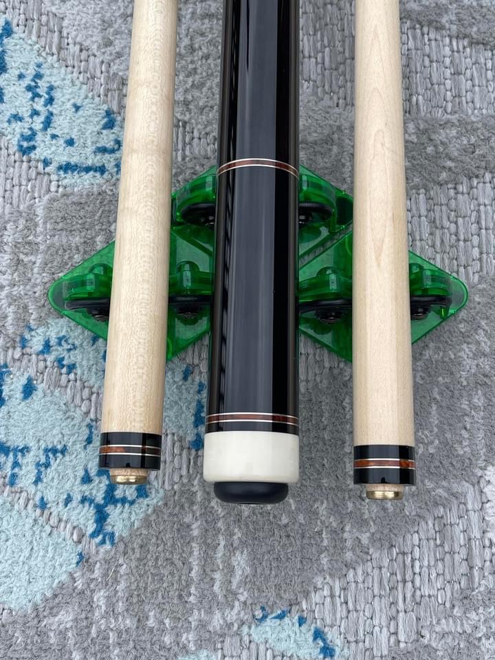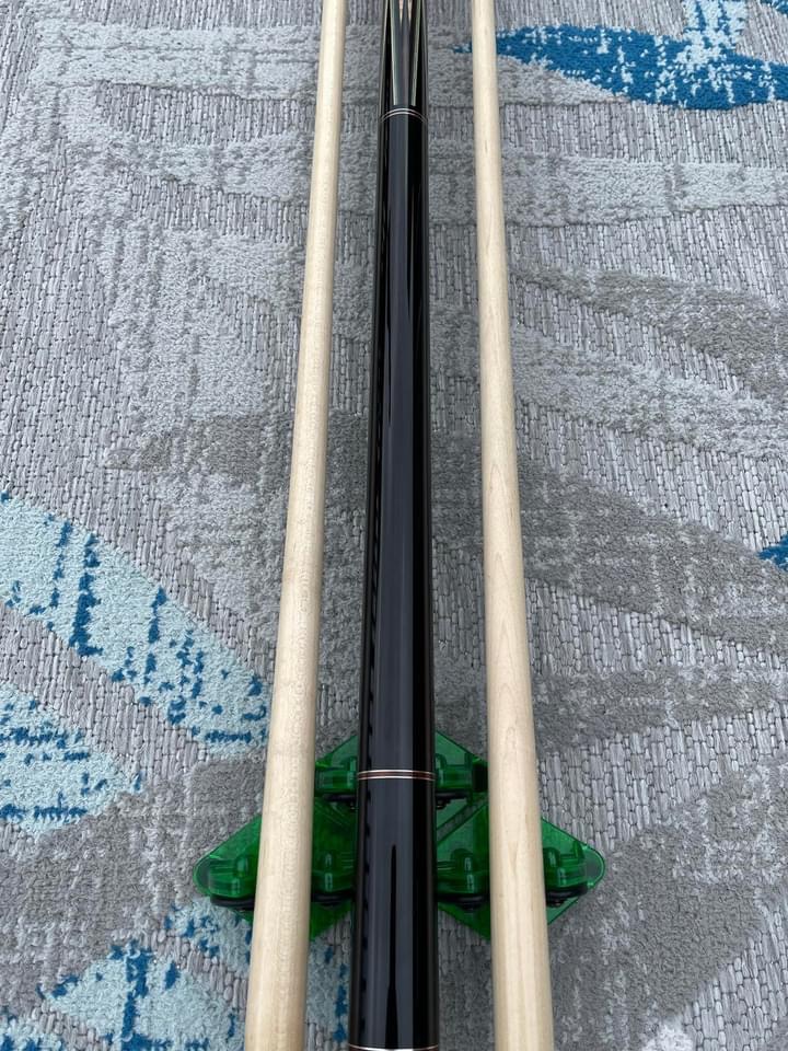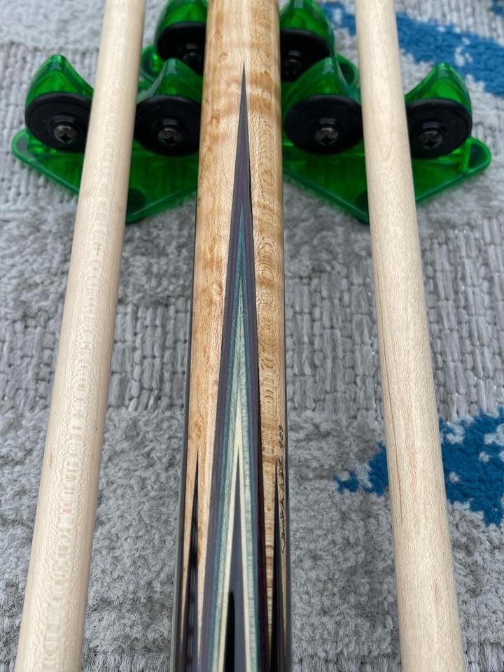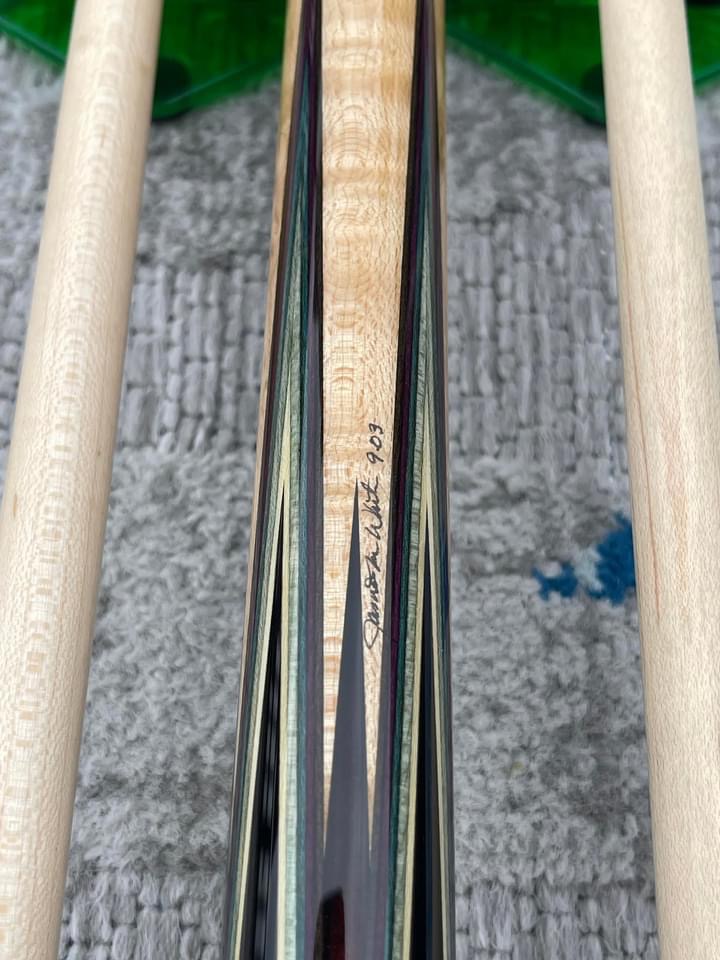 FS: Stunning James White (JMW) custom cue. It features a Birdseye Maple forearm with 8 beautiful Ebony (4-high) and Snakewood (4-low) alternating points. The Ebony points are surrounded by 5 stunning veneers: white/silver/blue/purple/black, with the Snakewood points surrounded by one single black veneer. This cue has an elegant slick black Ebony wrapless wood handle and butt sleeve, a 5/16x14 joint pin and beautiful ringwork at a, b, c, d positions that really complement the cue well. The cue is signed “James M White 9-03” in the forearm. This cue comes with 2 shafts with matching rings. It is unknown if they are original shafts, but it appears that at least 1, if not both may be original - based on a conversation with Mr. White and in confirming measurements on the pilots of the shafts. The previous 5 owners were also contacted to confirm. Lastly, this cue also comes with some extremely well made custom JPs made by Danny Sergeon. Everything rolls straight and is in excellent condition.