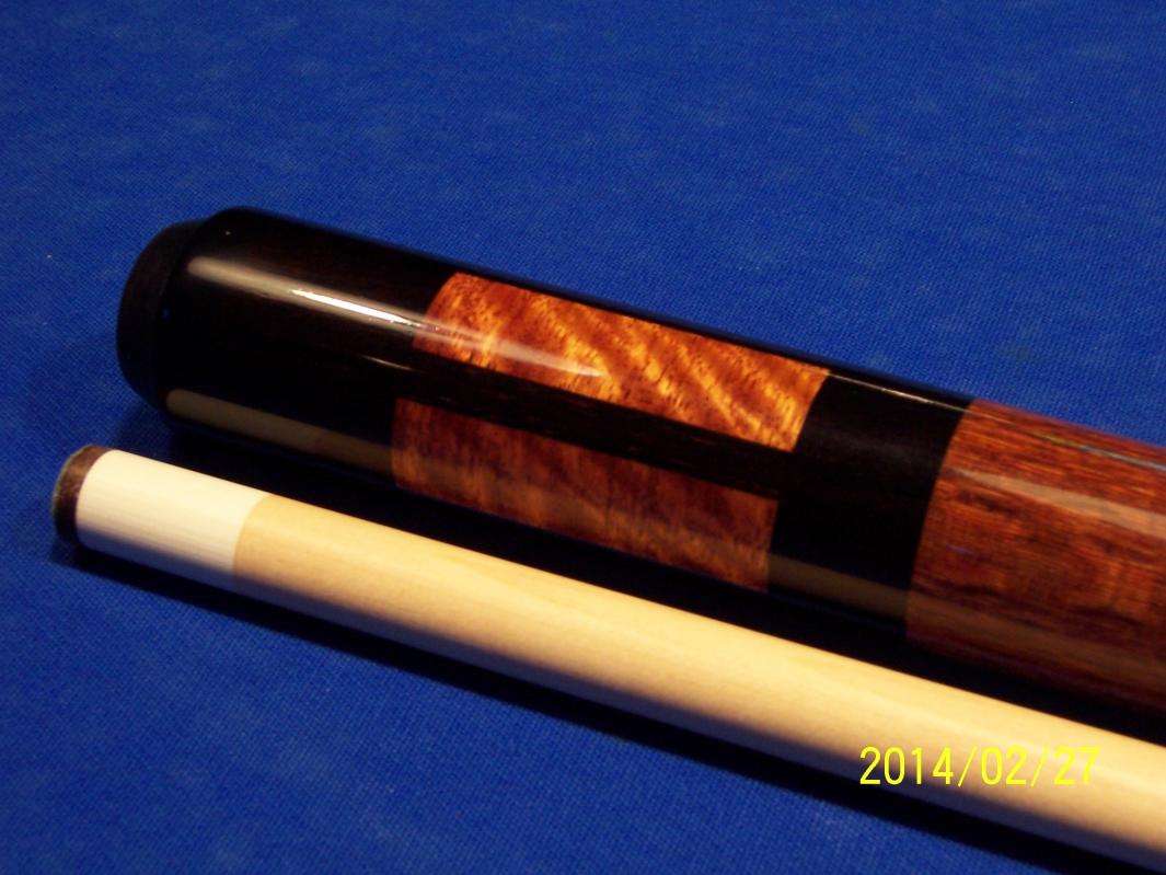 The woods in this cue are all top notch. Very Dark Rosewood, Lacewood handle and 5 Curly Narra Boxes that are like 3D in the butt. Just what I was looking for. Got to play a few racks with it today and the hit is as good as it looks. Can't beat that.... David