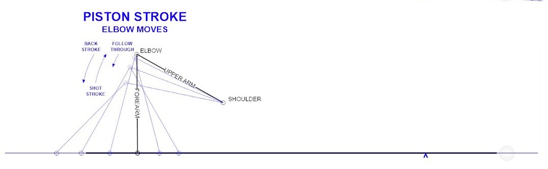 The "plain vanilla" piston stroke I'm familiar with the elbow doesn't go up above its original position (at address), but drops with the backstroke, then rises with the forward stroke (to its original position), and then (optionally) drops again with follow through on the shot stroke - all to keep the grip hand moving straight horizontally.