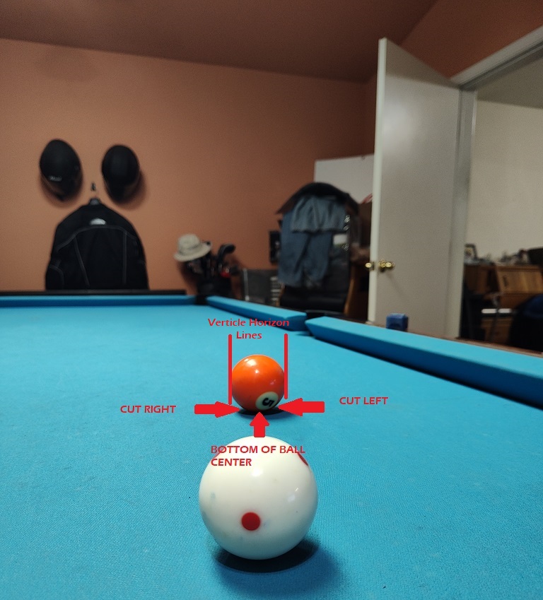 For this shot since it is obviously a cut to the left....you simply aim center CB to the cut left point where the cloth and ball meet.....(you can see the triangle that forms between the cloth and the ball)