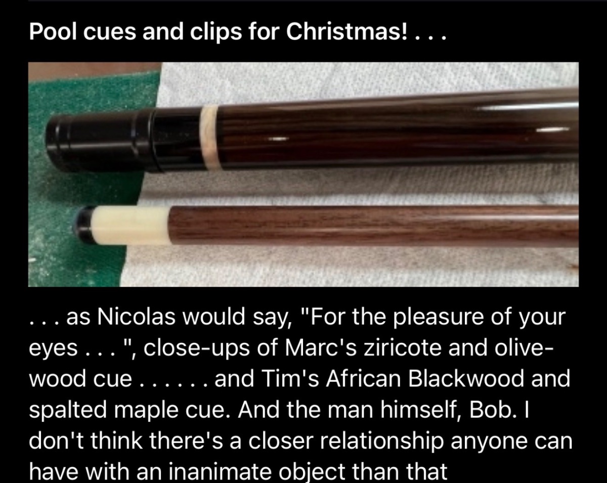 In 2014 he was 78, while not out of the possible I would be stunned if he was.I think he still makes cues. Tried several of them a few months back made of all kinds of different wood combinations. Just unusual hardwoods for shafts like ebony, oak, purple heart, olive, bamboo. Experimental? Different feel and aesthetics than I normally look for. Was hard to get the position I was aiming for , but my cues are the opposite of what Bob builds for his followers so I can say I was just not skilled enough to adjust my play for his cures.