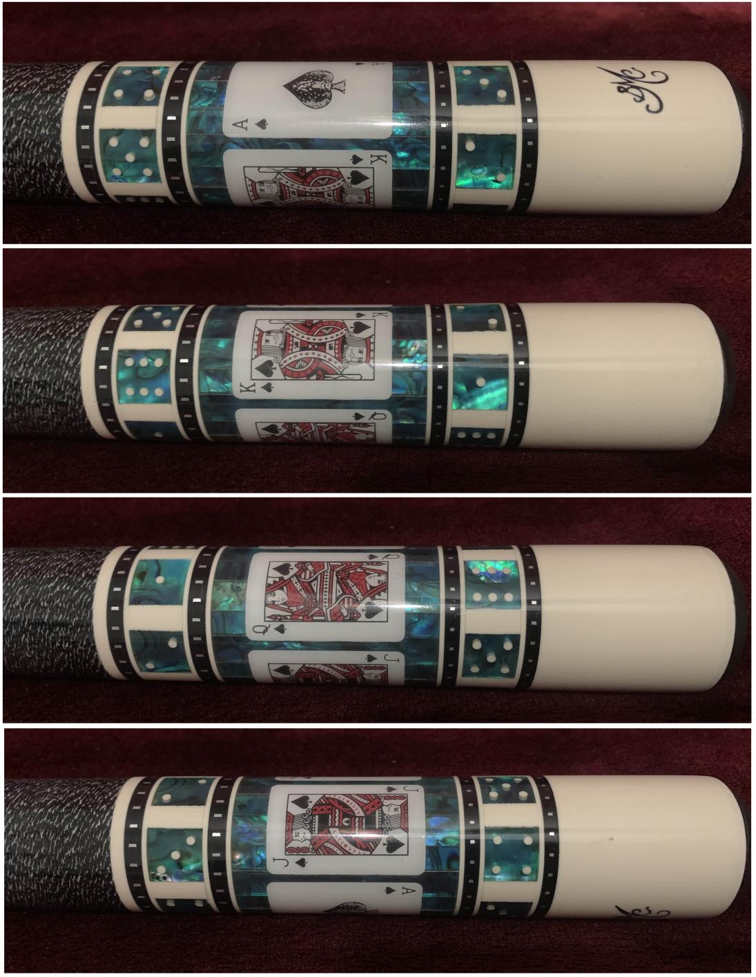 - Butt Sleeve: Consists of a 4 card royal flush in spades over a 48 piece blue Paua Shell sleeve trimmed with white on either side. Above and below this card sleeve are 6 Blue Paua Shell dice with white numbering bordered on either side by 24 1/32 x 1/16 silver rectangles. All is set in a white background. The dice are surrounded by imitation ivory.