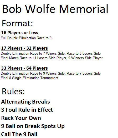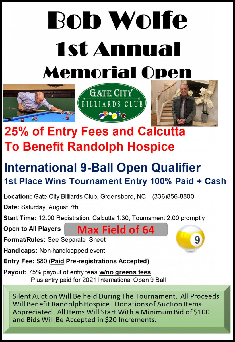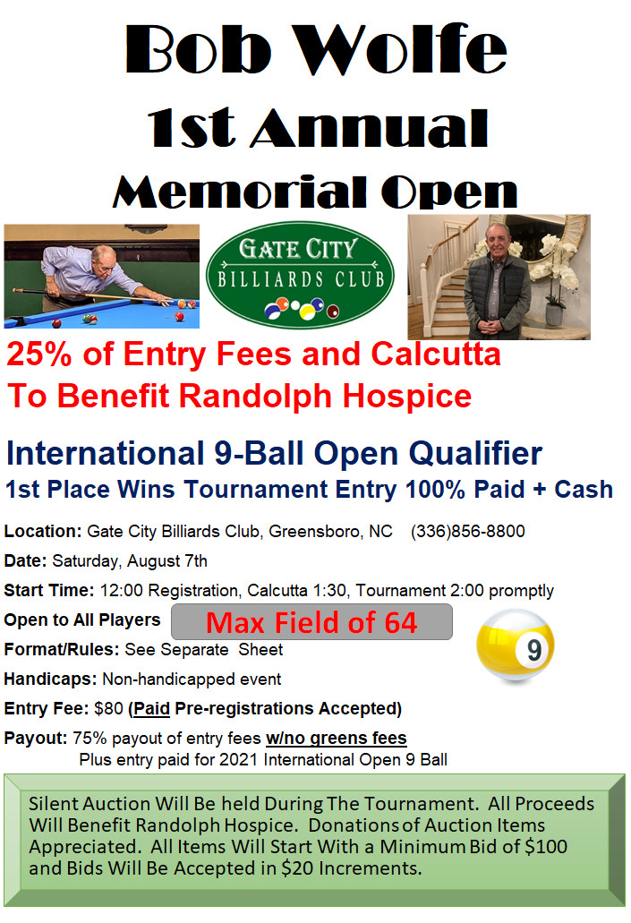 This tournament is the 1st annual Bob Wolfe Memorial tournament. Bob passed away recently from Covid related complications. We will raise money to honor Bob's legacy with proceeds going to the Randolph County Hospice. To raise money, we will have a silent auction with 100% of the proceeds going to the charity. Please contact me (Don Liebes) at (336)312-7207 if you have anything you could donate to be included in the auction (goods or services worth $100 or more) We will also donate 25% of the entry fees and Calcutta. Cash donations will be accepted.