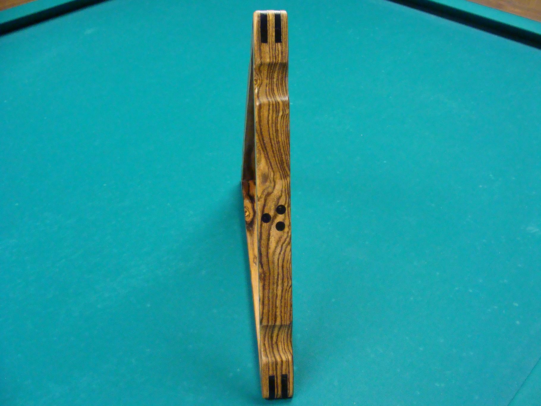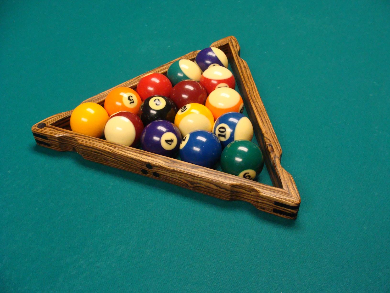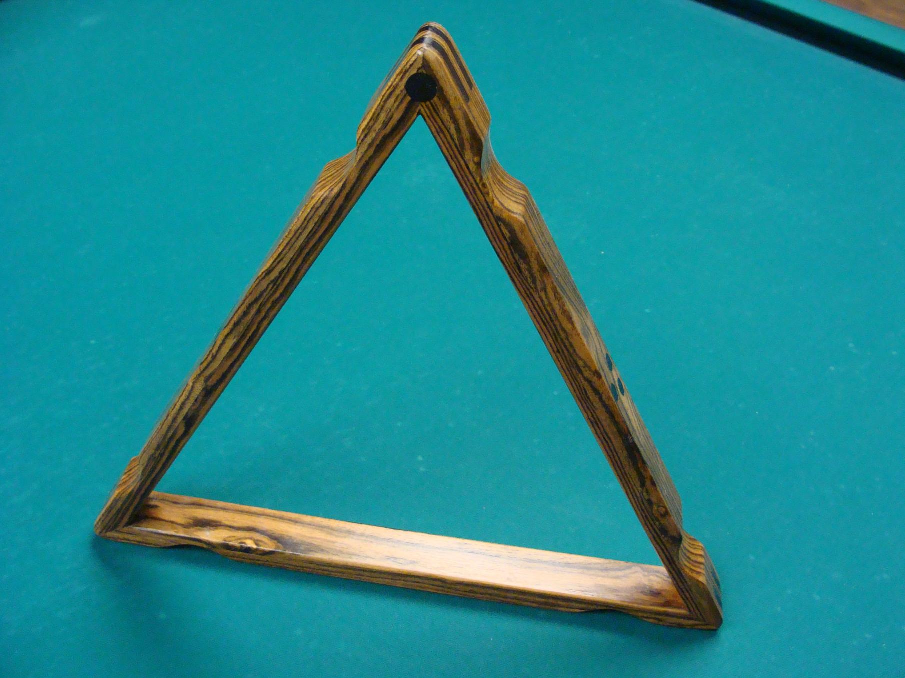 Up for sale is this exotic bocote wood triangle with ebony corner splines and epoxy accents. These triangles are one of a kind. No two are the same. Laminated construction for rigidity and stability to provide many years of accurate ball racking. The bocote wood blanks are sawed into strips, then reversed and glued back together to relieve any stresses in the wood.