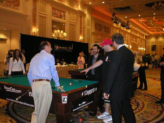 The IPT didn't take off on TV, even on the cable channel. There was a green room for the players and a first-class venue. In this shot, you can see both Mouths, the pool player and the poker player, Kevin Trudeau, the producer, and the pretty MC lady, whose name escapes me. The IPT staff even got this on Vegas local TV, trying to promote it.