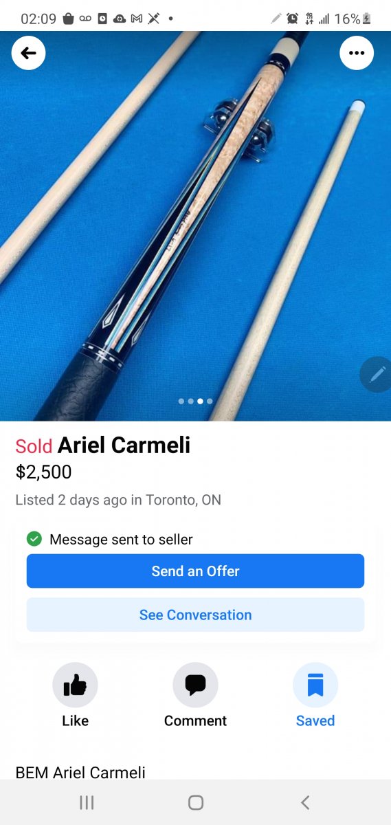 I like Carmeli cues. I do not like his signature. Once he signs the cue, I'm not interested. I think $2k US would be a fair price--if the cue is in excellent condition.
