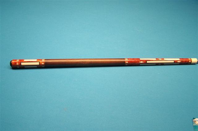 I do know, that in the episode Al (Dean Stockwell) mentions, that it is 21oz, in weight made with Ebony and inlaid with MoP, but the this cue stick is a mystery, as I can't even find out who made this cue, to try and get a better picture of it, oh well, I liked the challenge of finding a few good pics at least
