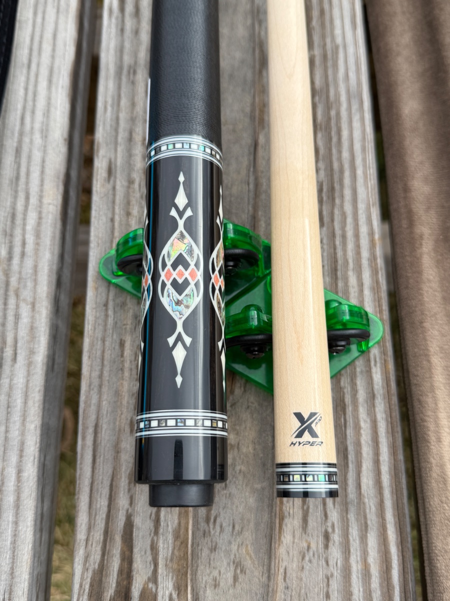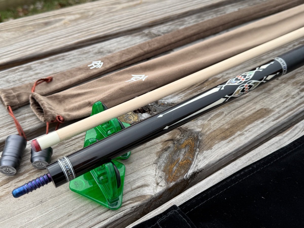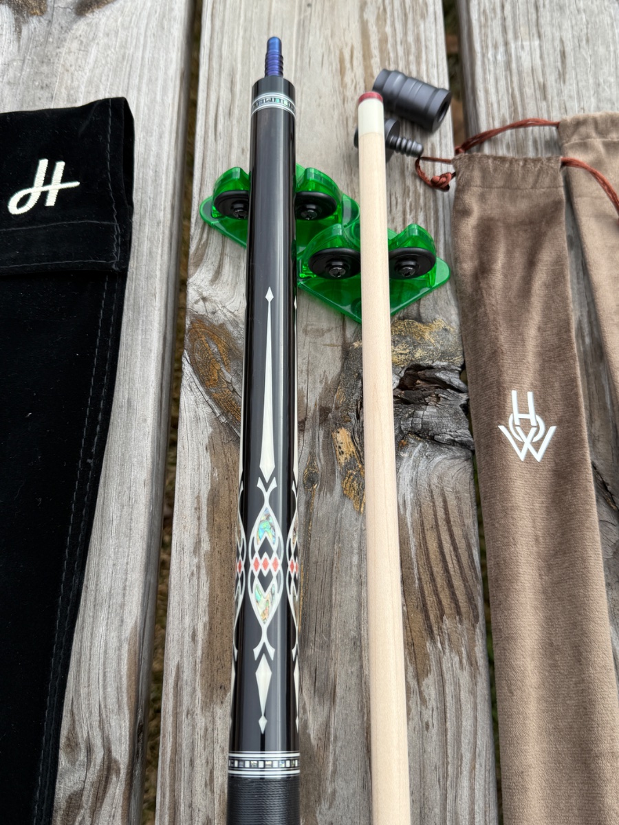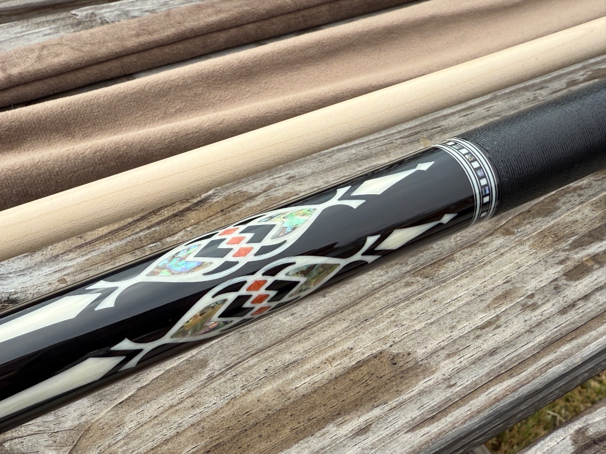 This cue features an incredible Ebony handle cue filled with absolutely stunning abalone shells and pink ivory inlays throughout. It contains a very elegant segmented handle separated by fancy abalone filled and silver rings and complemented with a black linen wrap. To finish this cue off is a classy purple big radial pin putting the icing on this masterpiece of a cue!