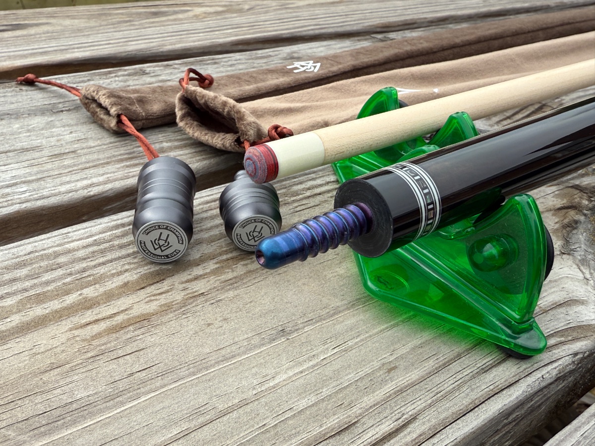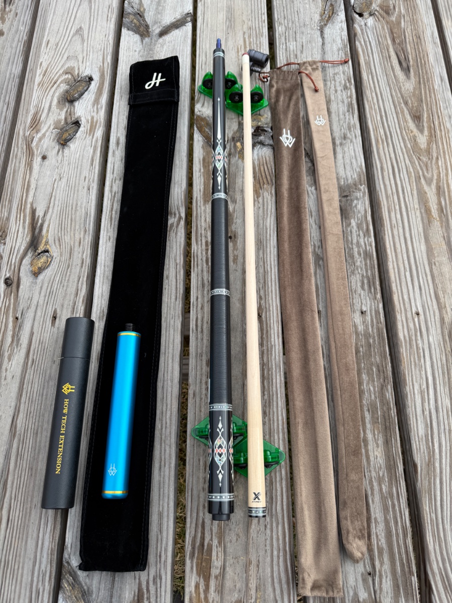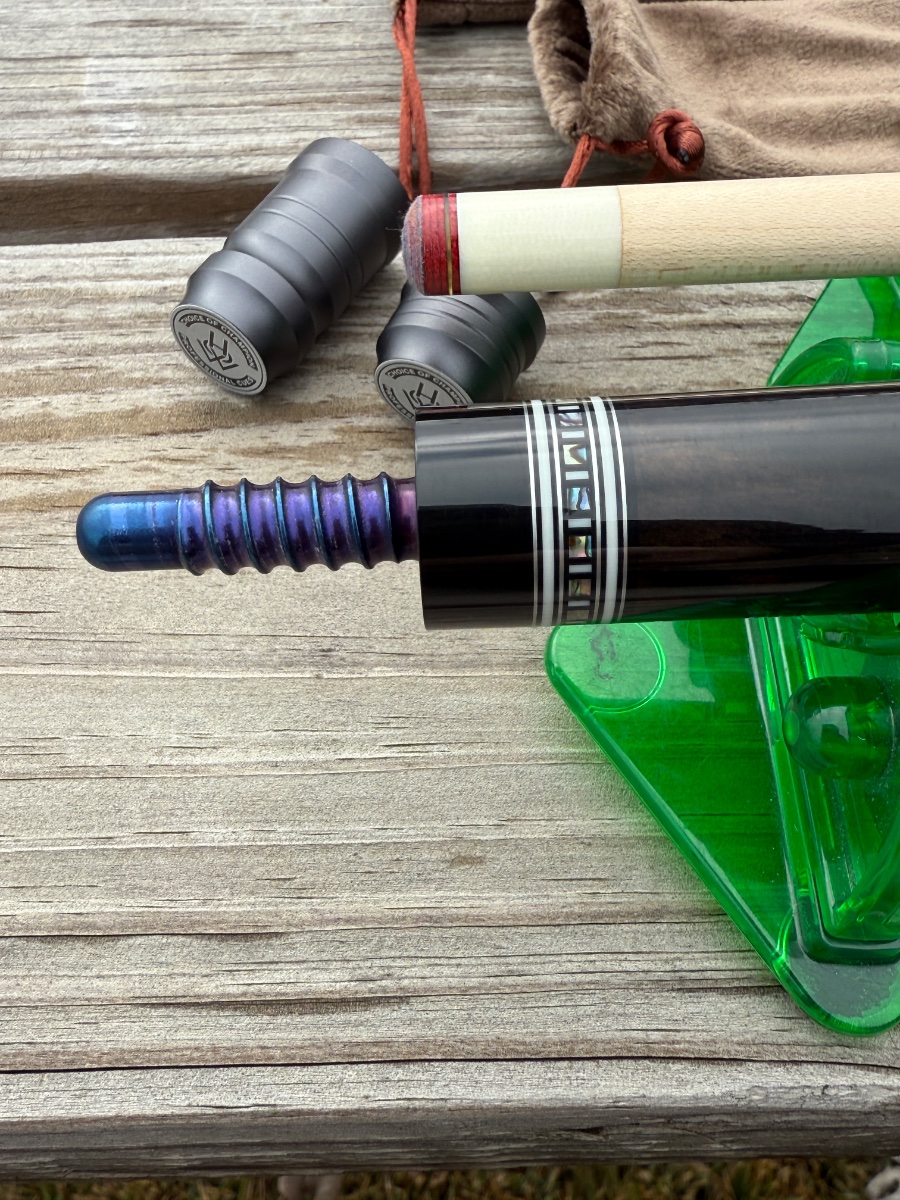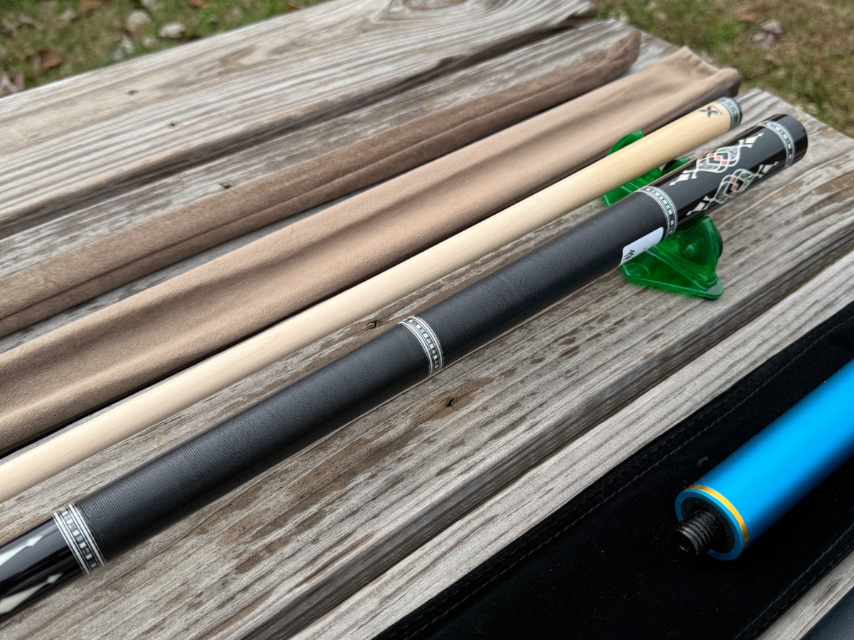 This cue features an incredible Ebony handle cue filled with absolutely stunning abalone shells and pink ivory inlays throughout. It contains a very elegant segmented handle separated by fancy abalone filled and silver rings and complemented with a black linen wrap. To finish this cue off is a classy purple big radial pin putting the icing on this masterpiece of a cue!