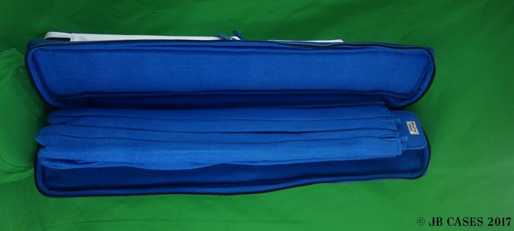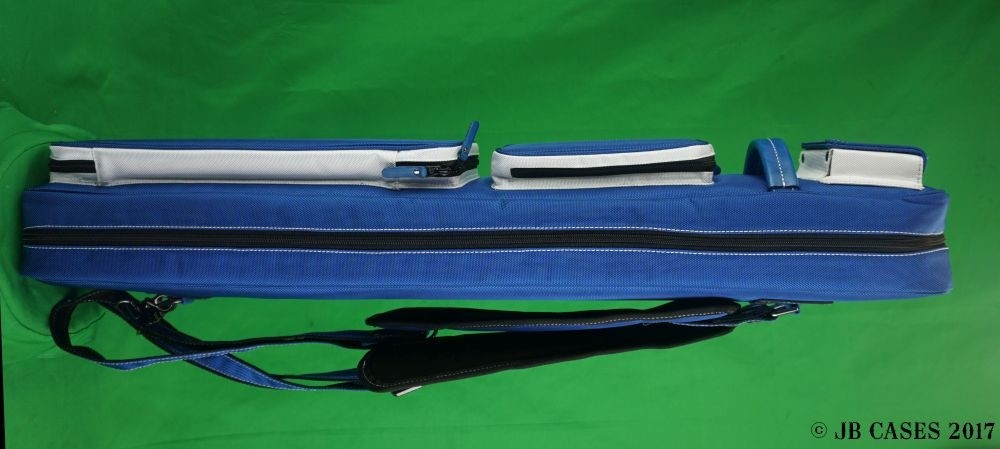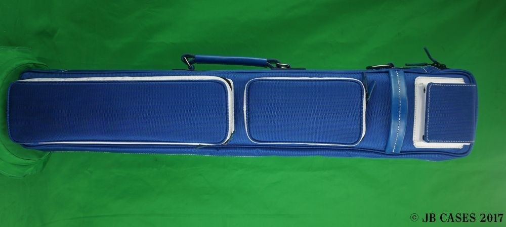 This case holds 4 butts and 8 shafts. Maximum interior length capacity is 31.5". This case is made of durable nylon/polyester material with reinforced leather stress points. Features an UltraPad interior and very comfortable handles. Featuring a non-slip well padded shoulder strap. Zippers are the highest quality available and each zipper has two pulls in case one should break. Leather Handles and Two roomy pockets for easy access to your essentials. Blue body with White pockets sides, dark blue Interior, Top Magnetic Pocket, White Stitching, Backpack Straps, pocket tray., towel ring.