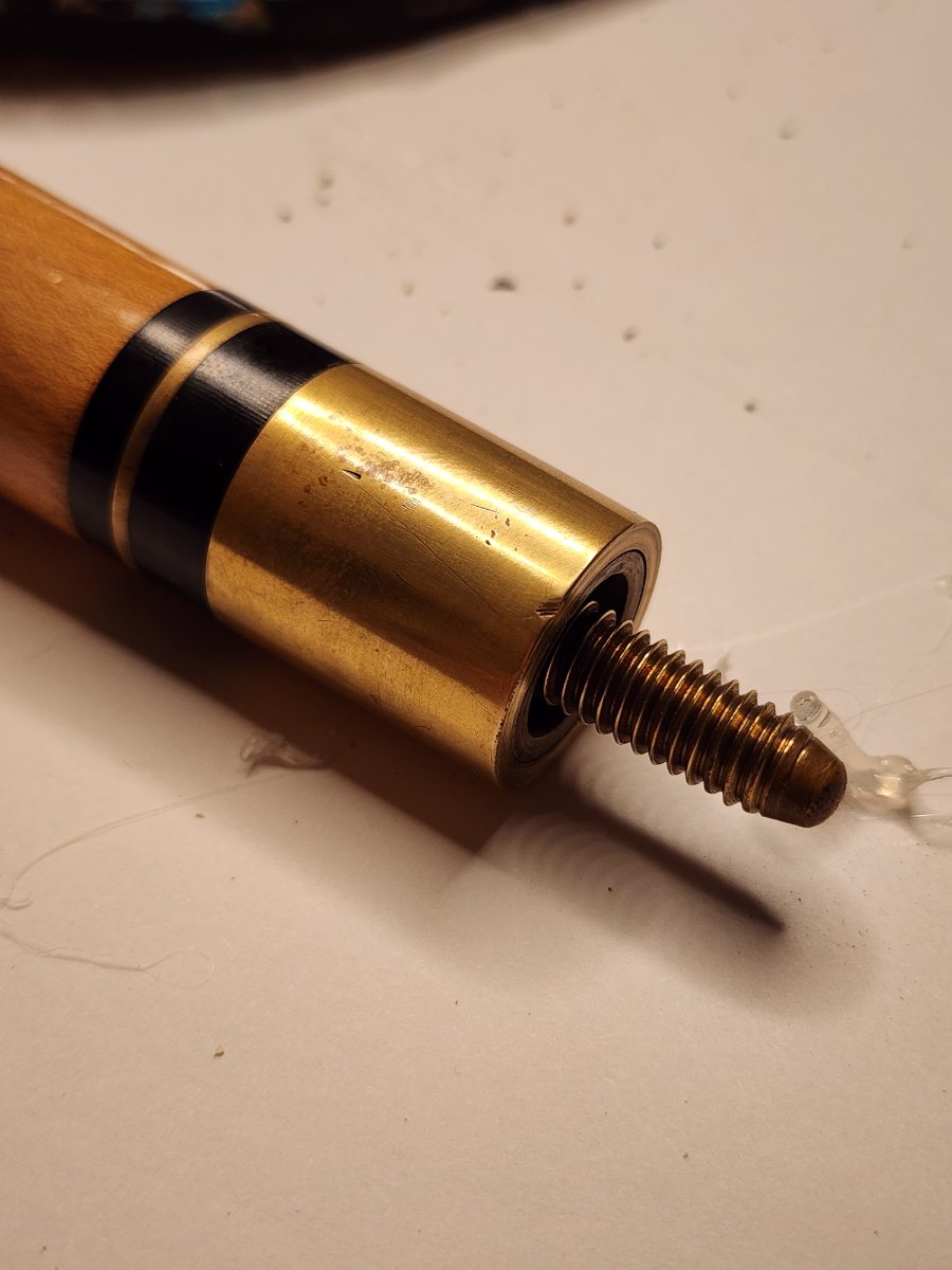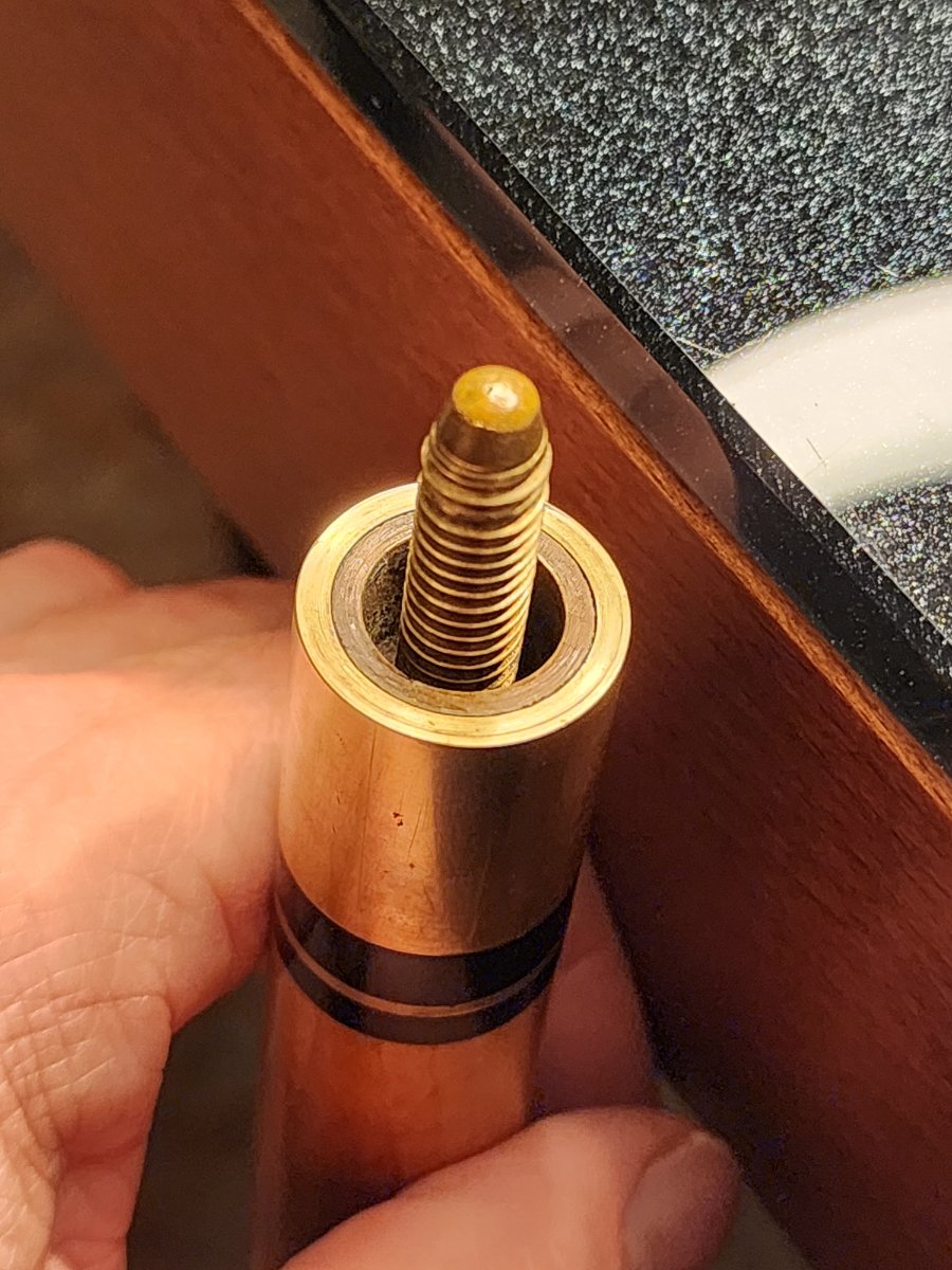 I have this old Adam cue with a brass joint collar. This cue hits very well, but is just a tad forward balanced for my tastes. I was hoping to change things a bit by replacing the brass with something lighter. Is this feasible? If so, can anyone guess or tell me the size here and where I could get the piece I need? Thanks!