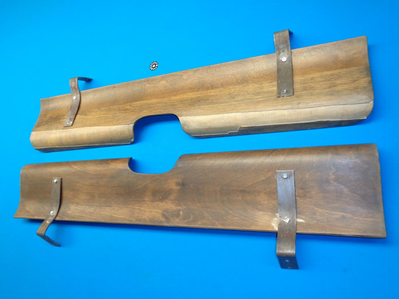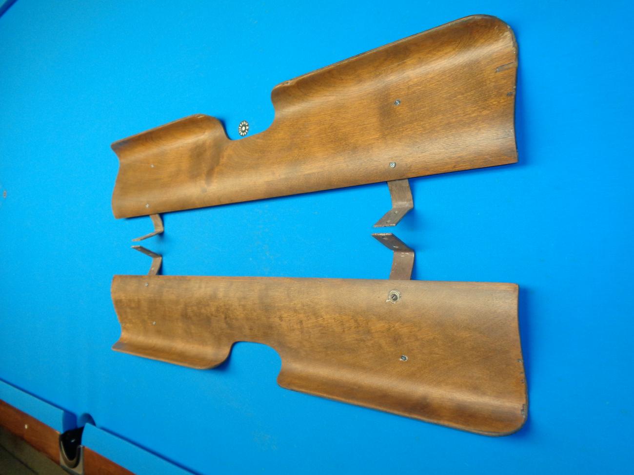 I have a take off set of bridge holders for a Brunswick Centennial or Anniversary table, I’m sure they will fit others, but this is what they came off of. The up sides are in very good shape, the bottom side is missing one part of a veneer that is about a 1” strip missing on one as viewed in the pictures. Shipped to your door for 275.00, paypal or cashiers check or postal money order. rkoby@gorge.net