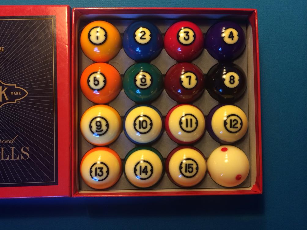 In great shape. I can only see a scratch on the 4 ball which is tiny and won't affect play. No chips at all. Comes with a measles cue ball as I use the original blue circle cue for practice with my breakrak and it's getting pretty beat up.