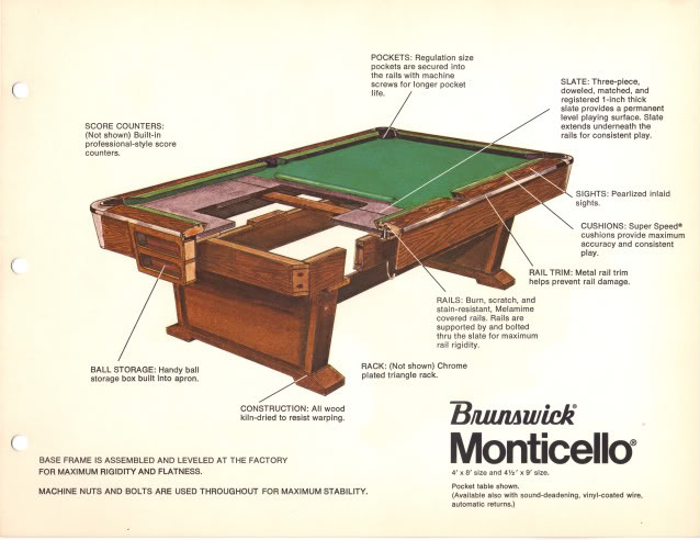 The pamphlet I found on AZB shows the Brunswick Monticello was probably a 1970s Brunswick home table. It was one of the three or four top home tables from Brunswick, identifiable because they used 1" slate and heavier frames, as compared to the 7/8 " or 3/4" slate, or wood honeycomb used on lower end Brunswick home tables.