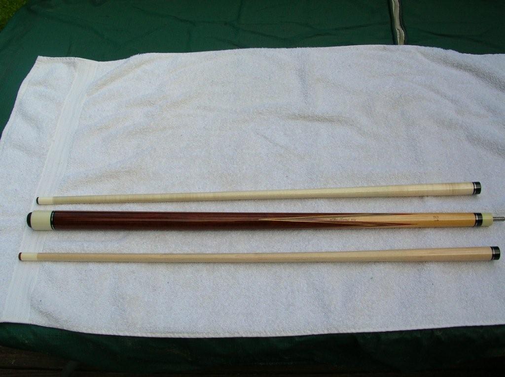 and was done 6/08. It has 2 Tascarella shafts with ivory ferrules. The joint and buttcap are ivory substitute. The joint is flat faced with 5-16/14 pin. It has a silver ring at butt and joint. The butt weighs 15.5 and the shafts are 4.0 and measure 12.75 with moori medium tips.The original weight was left on this cue by request. Really solid player. For Sale. $1200 obo .