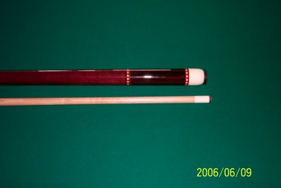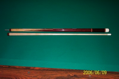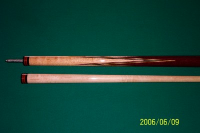 Cue appears to be a old Brunswick Titlist that has been modified, would like to know who made it. Butt cap is Ivory, and the Ferrule is also Ivory. The Butt cap appears to be made from a cue ball, although I am uncertain. The cue is Purple Heart up to the points, with Cocobolo added on the butt.