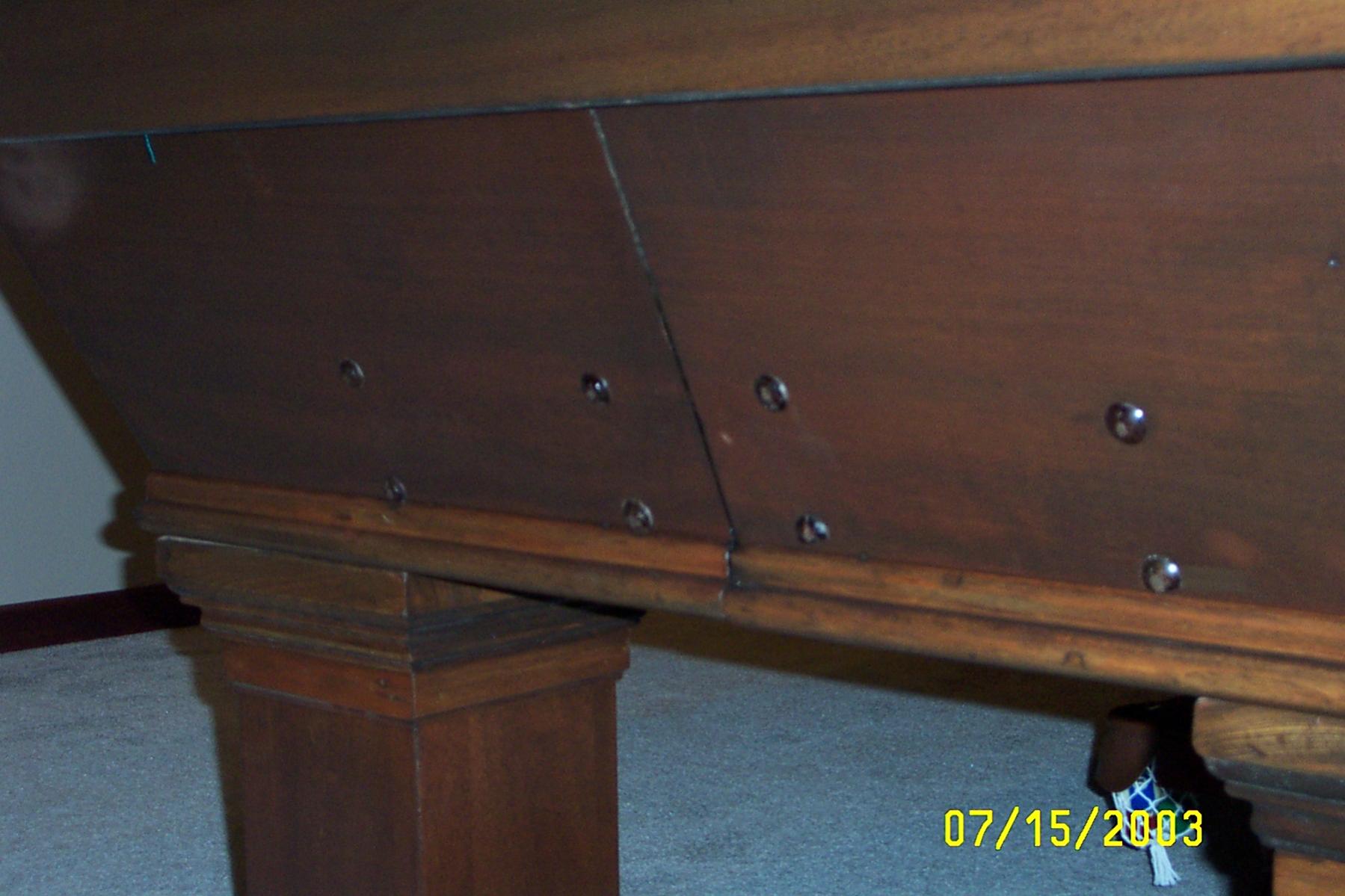 Yeah... that was my first stop. The guy I bought it from said he thought it was a Brunswick and the recess in the rail suggested it once held a Brunswick plaque. Unfortunately, I couldn't match it to anything on the Brunswick site, which makes me doubt its supposed origin. It's clearly a very old table and it has seen some abuse; I daren't imagine how many layers of stain and varnish have been carelessly slapped on over the years. Ideally, it needs stripping back but I fear I would cause more damage. Maybe that's a task for my retirement. Right now, I'm more interested in getting the slate laid and potting a few balls with friends and family. It would be nice to have some history to bore them with while we play.