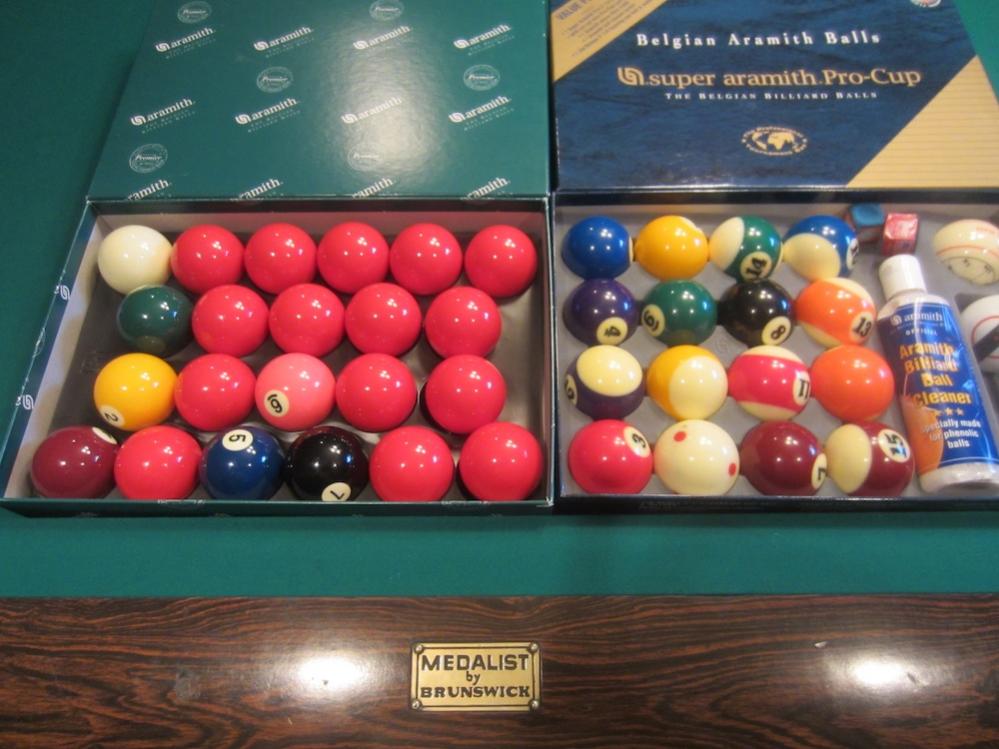 Brunswick Medalist 9ft Pool Table with Simonis cloth in excellent condition. Pool accessories include two sets of Aramith premier balls - pool and snooker, four house cues, bridge, brush and chalk. Also includes protective cover insert in order to use as a table.